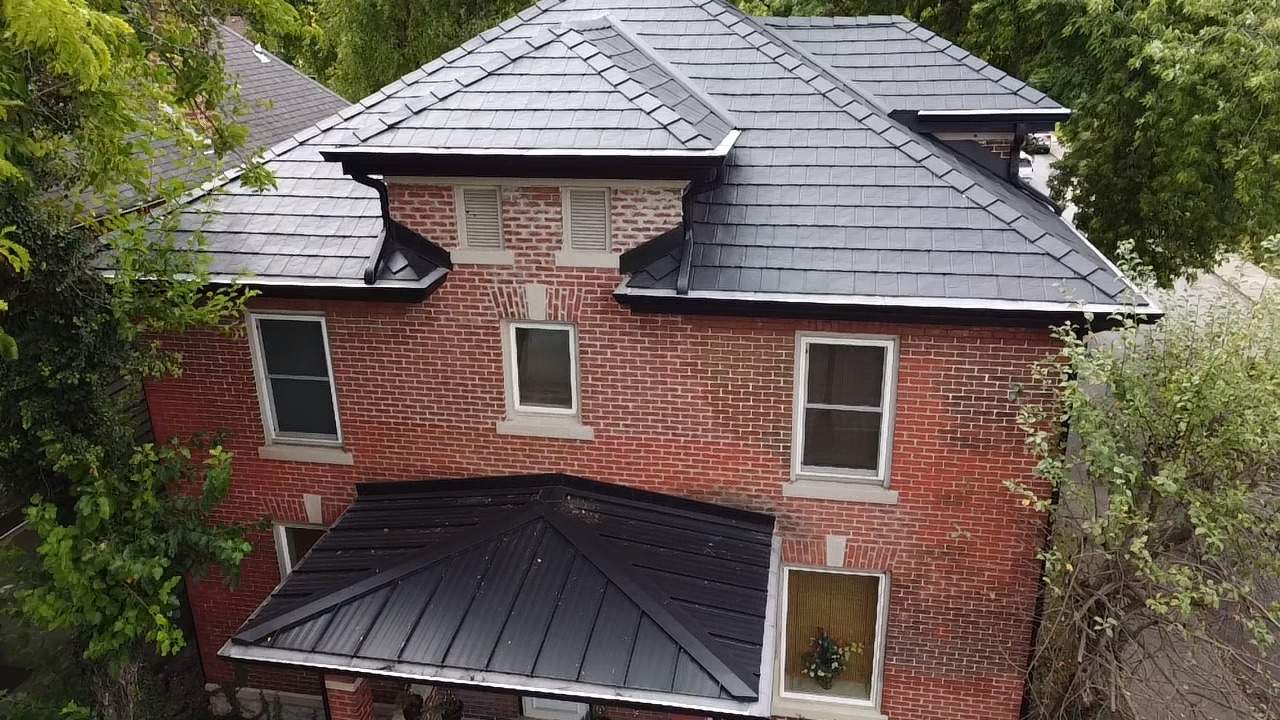 This downtown Fort Wayne roofing project features a combination metal roofing system installed on a historic-style brick home near the city center. The primary roof surface was upgraded to a metal slate shingle profile, delivering the dimensional appearance of traditional slate with the long-term durability of steel. For the lower-pitch porch accent, a mechanically seamed standing seam system was installed to provide clean lines and improved water-shedding performance on the reduced slope. Properties in central Fort Wayne require roofing solutions that complement surrounding architecture while performing in Indiana’s freeze-thaw climate. By combining metal slate shingles with standing seam accents, this installation balances historic aesthetic appeal with modern structural performance. Located in Allen County, this project reflects how multi-profile metal roofing systems can be used strategically to enhance both function and design in urban environments.