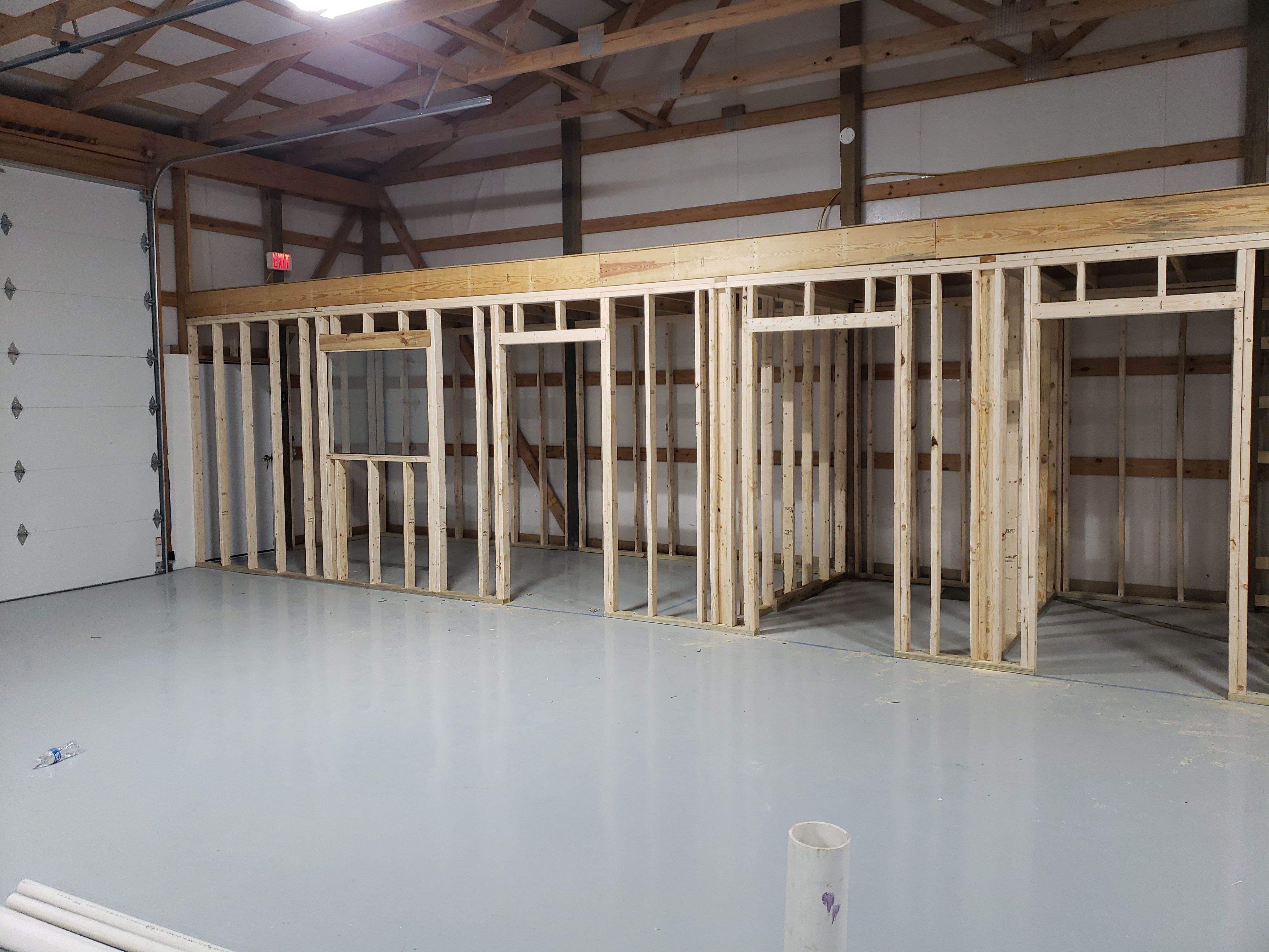 The client needed to partition a functional office, bathroom, and storage area within their warehouse while maximizing overhead space with a load-bearing mezzanine. We engineered the structural framing to include a reinforced storage deck and a custom viewing window for shop-floor oversight. Delivering a "Step Above" surprise, we completed the entire build in just a single day!