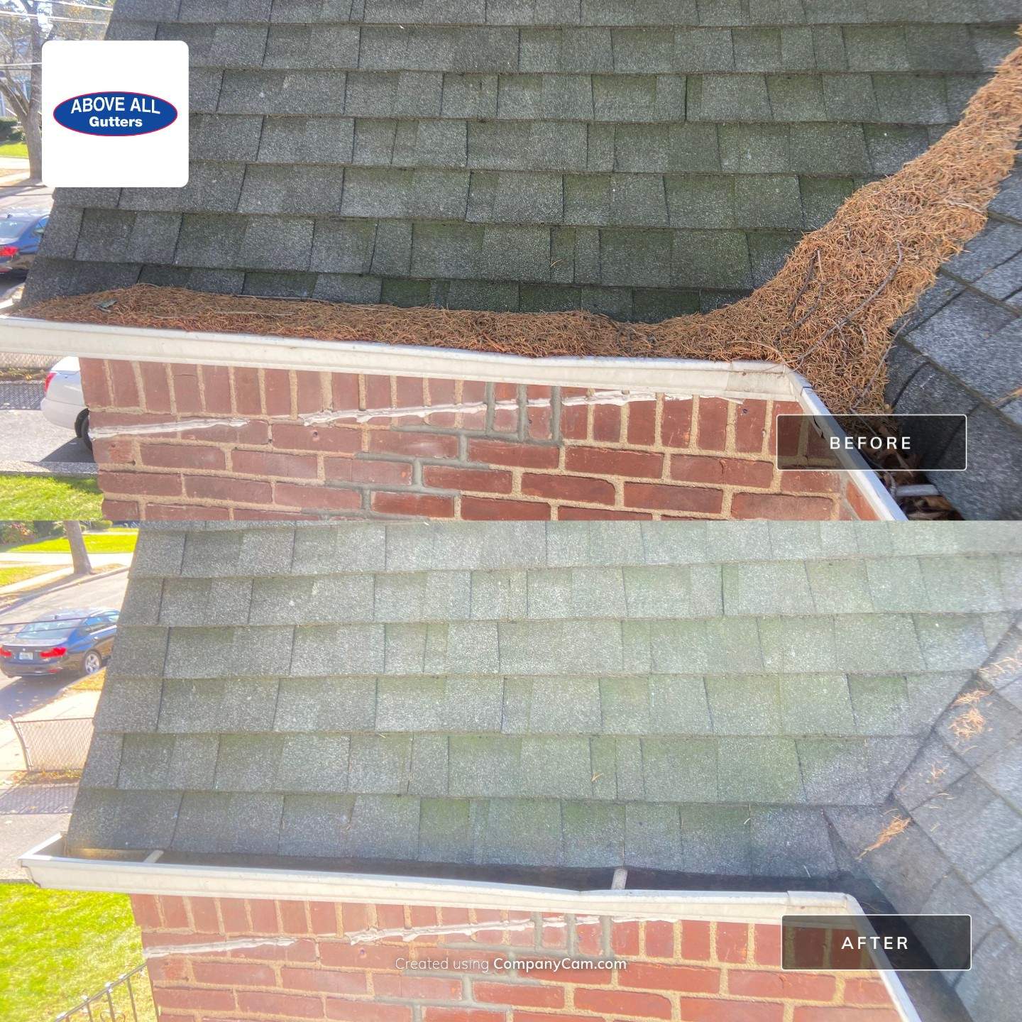This is an overdue gutter cleaning job in Valley Stream, NY. Don't let the small size of pine needles fool you. Millions of them can add up to weigh down your gutters beyond their capacity.