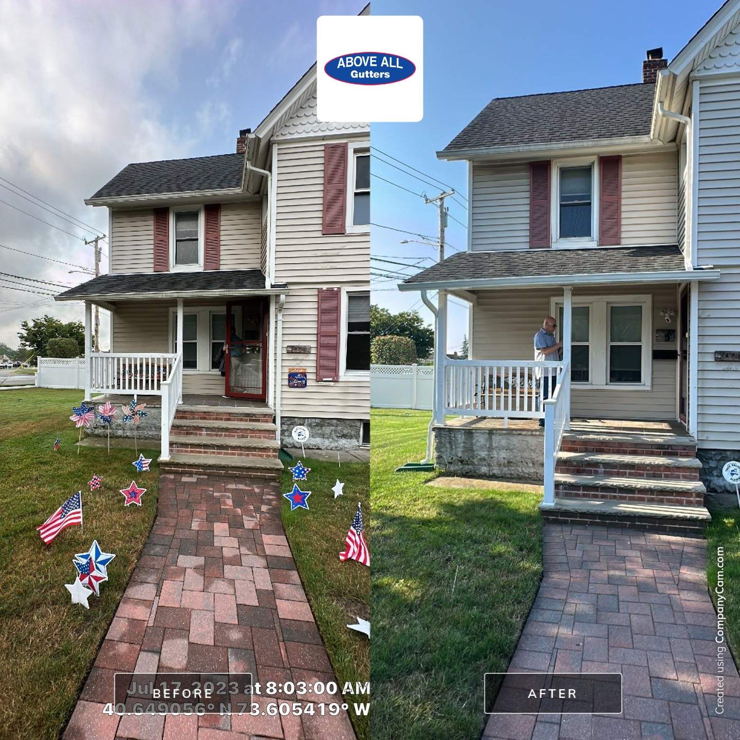 The gutter was originally angled towards the front door, causing water to overflow and wash out the front steps. It's important to keep the leaders of the gutter to the corners of the house to prevent this from happening. Otherwise, walking in from the rain could result in an unwanted shower.