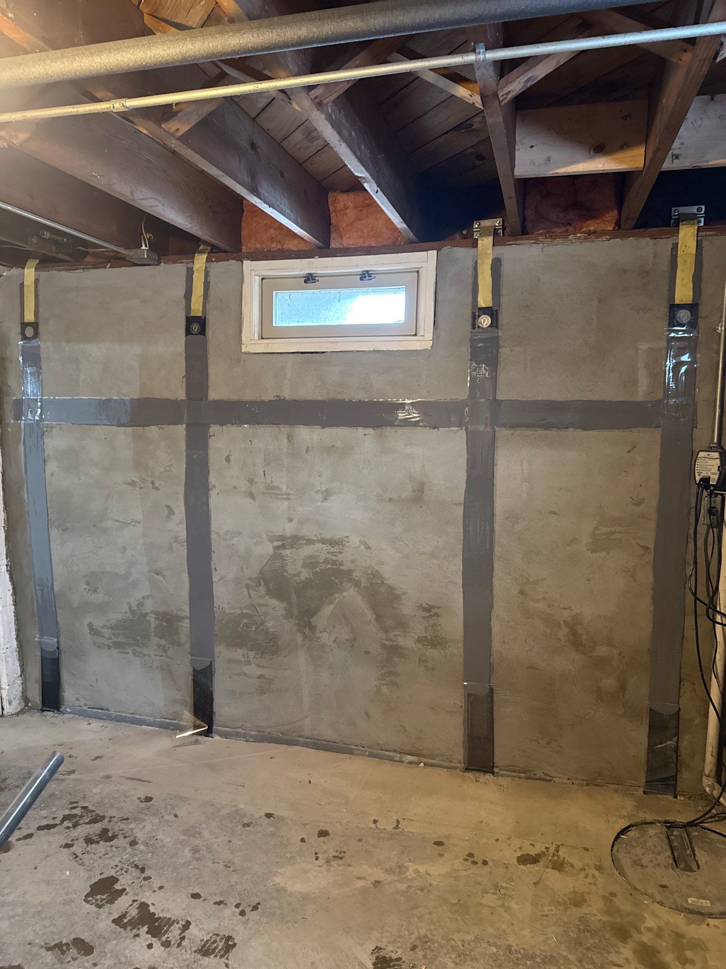 In this project, we had a customer whose basement walls were bowing near the frost line. First, we parge coated the foundation walls using Type S mortar. Next, we installed Fortress Invisibeams vertically, with a cross brace going horizontally to further strengthen the walls.