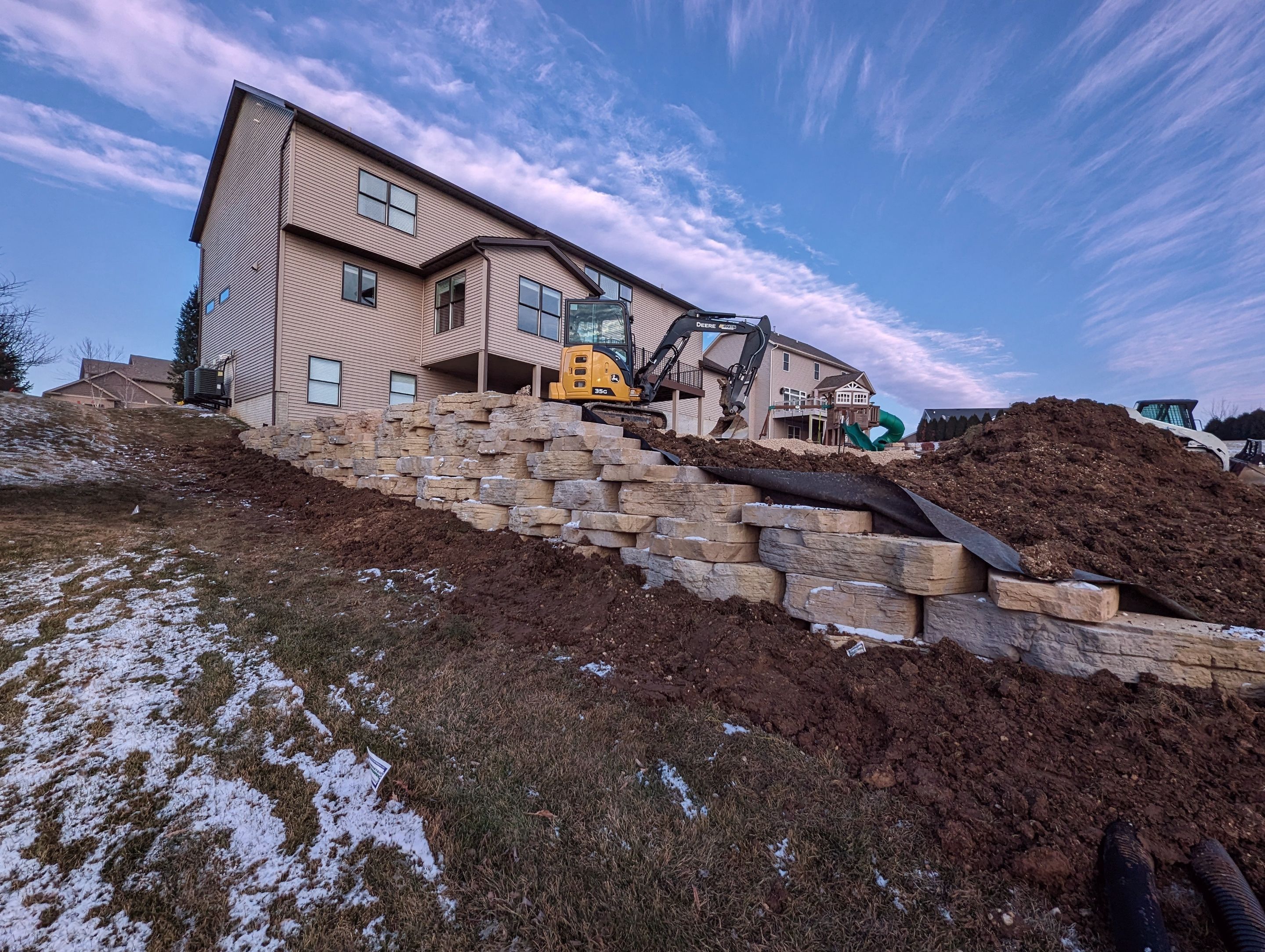 Here was a fun one! We installed a 65' retaining wall, 7' at its highest point, then backfilled with 225 ton of a drainable granular fill. This customer is ready for a nice new patio to be installed on the newly usable flat space!