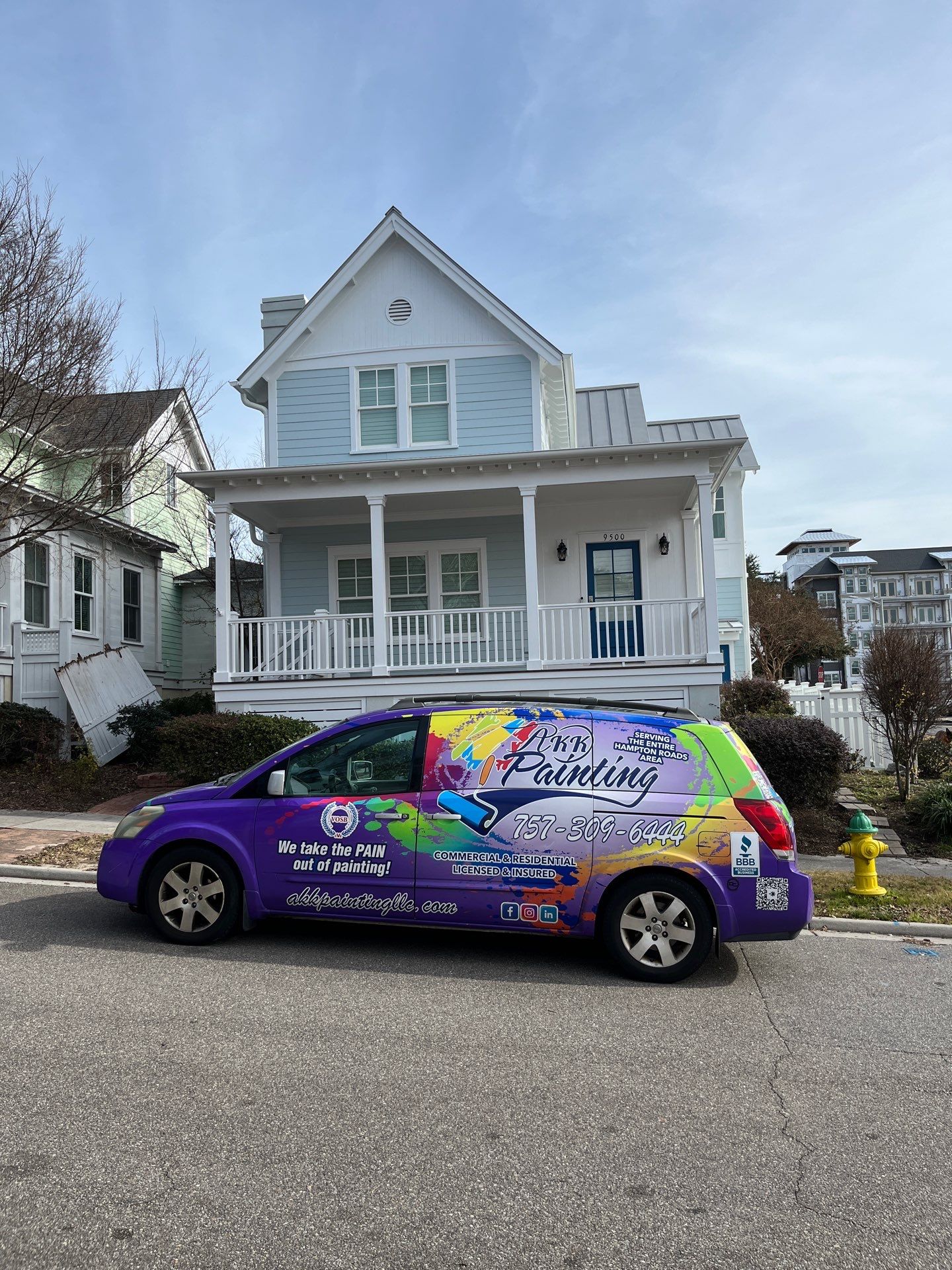 Pressure washed entire home. Made minor repairs to rotten wood. Re-caulked all trim and siding. Applied two coats of an exterior latex semigloss paint to all white trim throughout the house, as well as fence. Applied two coats of an exterior latex satin paint to all siding. Painted foundation.