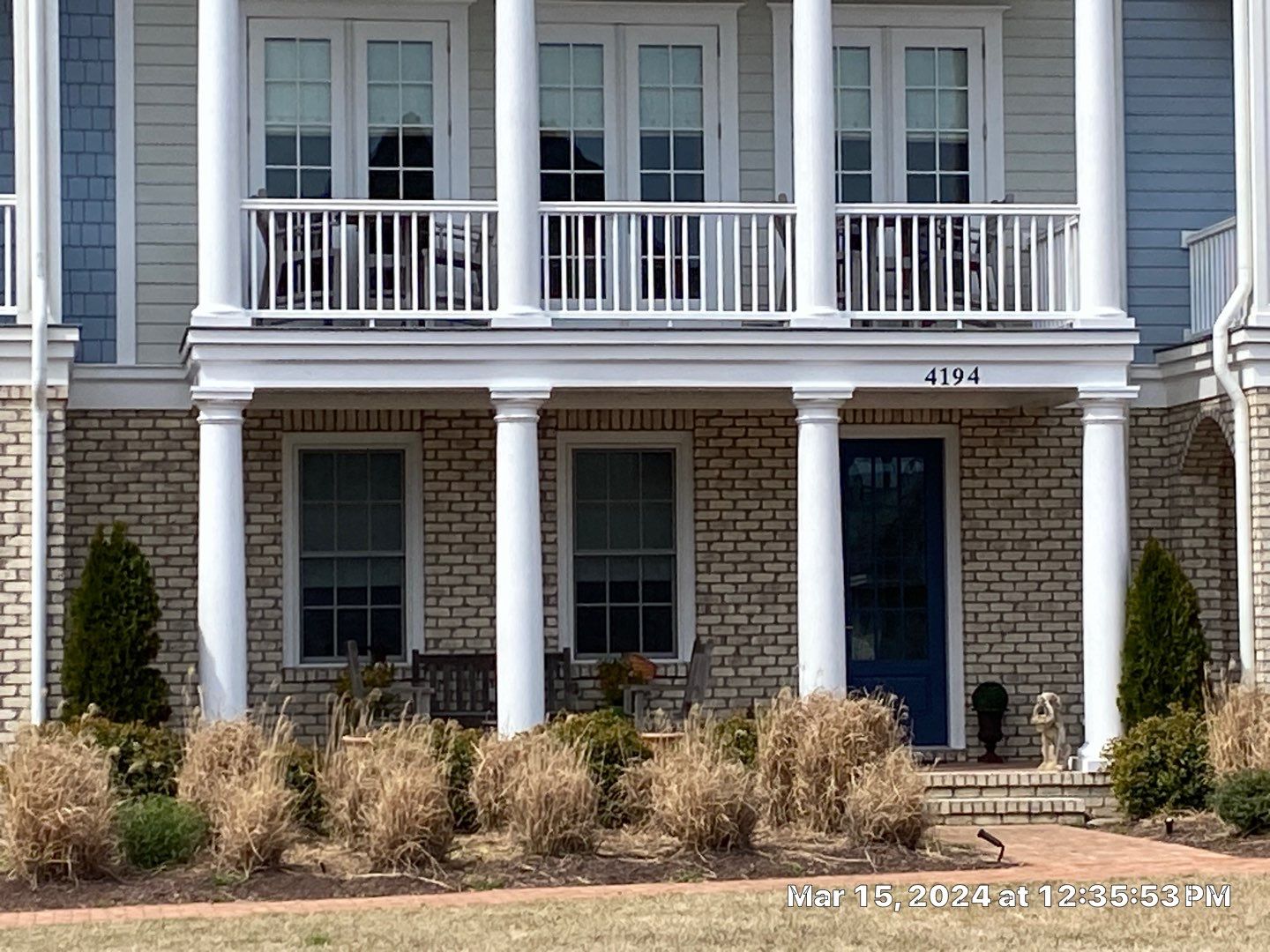 Pressure washed entire home. Made minor repairs to rotten wood. Re-caulked all trim and siding. Applied two coats of an exterior latex semigloss paint to all white trim throughout the house, as well as fence. Applied two coats of an exterior latex satin paint to all siding.