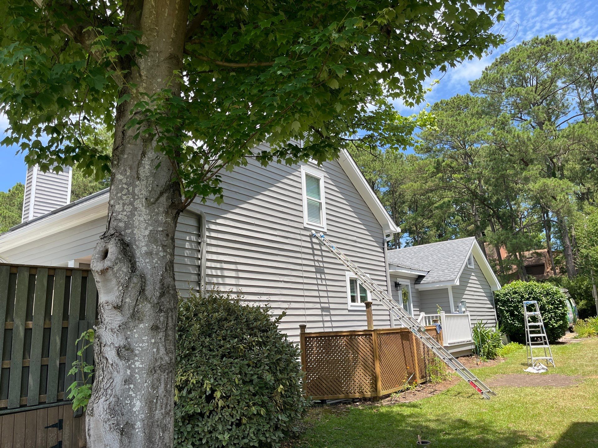 Pressure washed entire home. Made minor repairs to rotten wood. Re-caulked all trim and siding. Applied two coats of an exterior latex semigloss paint to all white trim throughout the house. Applied two coats of an exterior latex satin paint to all siding.