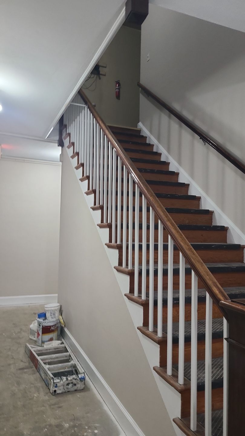 Made several plaster repairs to ceilings, walls, and trim. Painted all ceilings with a SW super paint flat paint. Painted all walls with a SW super paint satin paint. Painted all walls with a SW super Semigloss satin paint.
