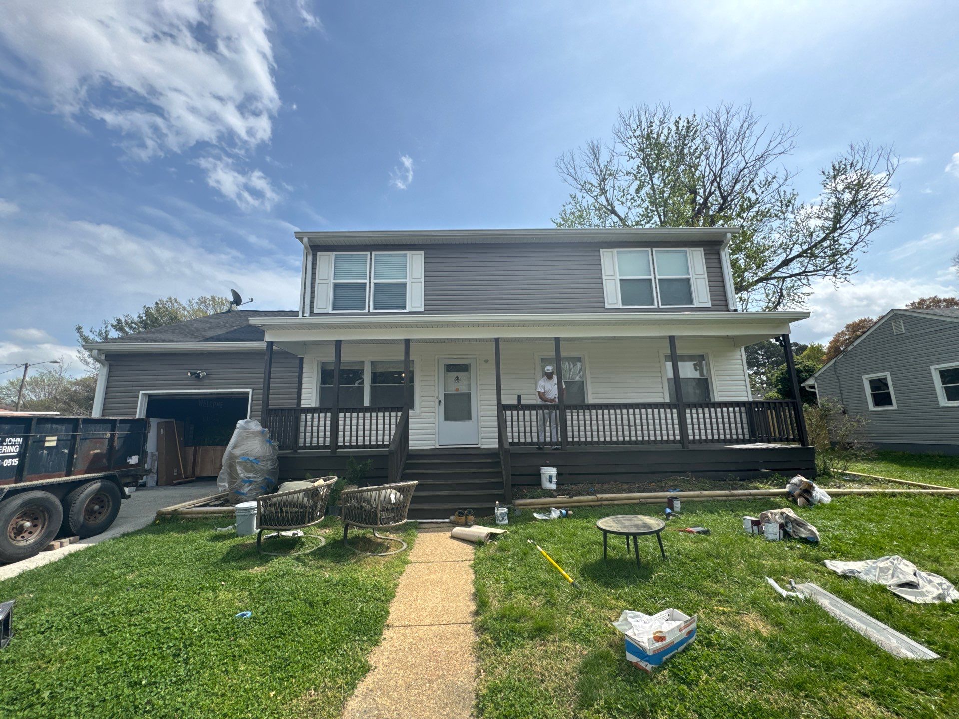 Pressure washed the entire exterior. Painted all siding with two coats of Latitude and two coats of super deck semitransparent stain to front deck.