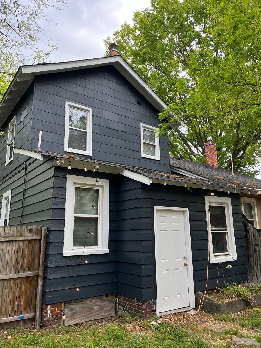 Pressure washed entire home. Made minor repairs to rotten wood. Re-caulked all trim and siding. Applied two coats of an exterior latex semigloss paint to all white trim throughout the house, as well as fence. Applied two coats of an exterior latex satin paint to all siding.