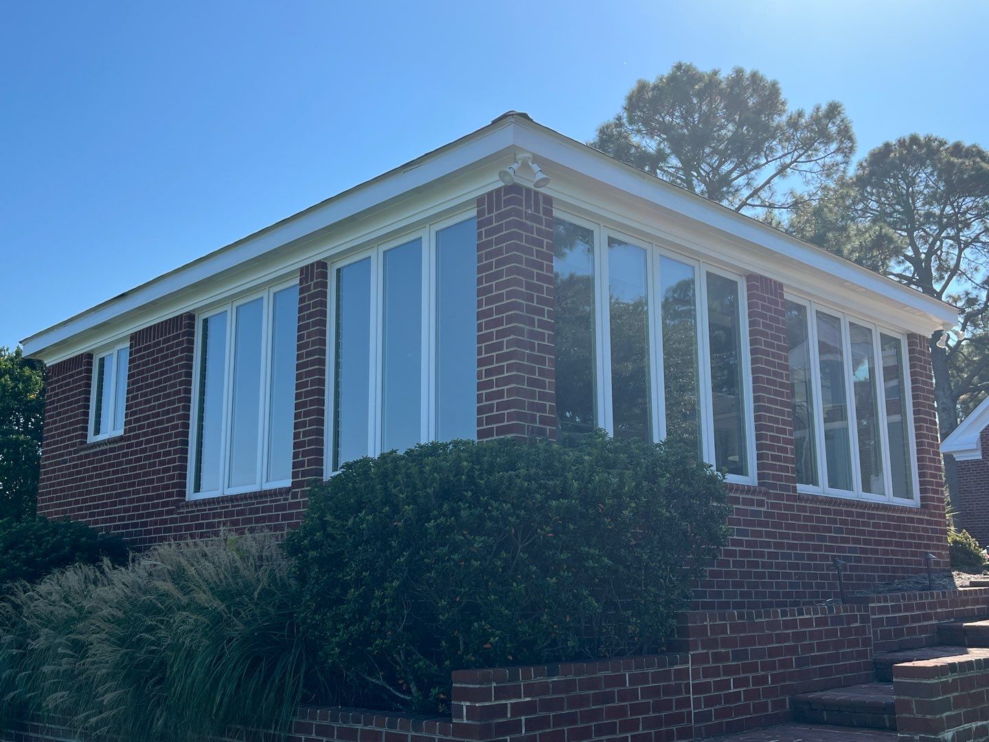 Pressure wash entire exterior of home. Lightly sanded all trim and made minor repairs. Spot primed all raw wood areas. Applied two coats of an exterior latex Soft Gloss paint by Benjamin Moore-Mor Glo. To all soffits, window frames, door frames, garage door frame, and garage doors.