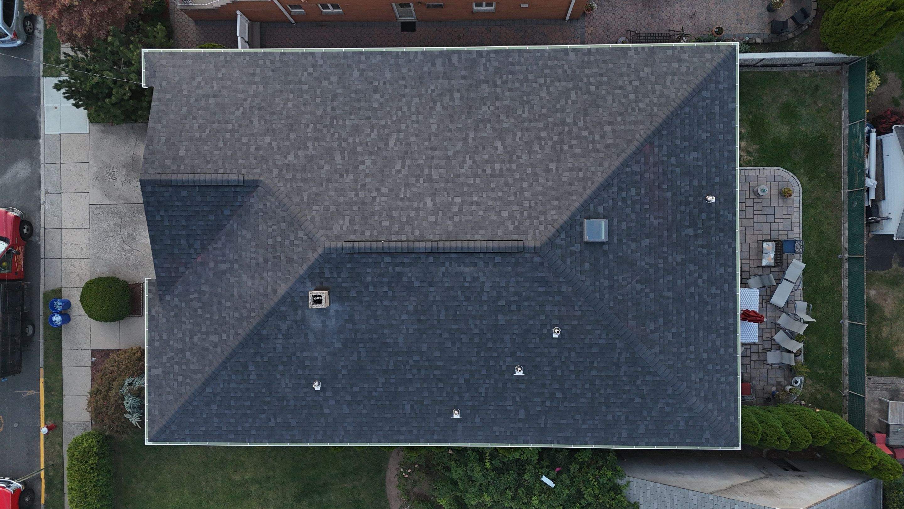 Roof replacement completed in Ridgefield, NJ. Featuring Owen's Corning TruDefinition Duration in Onyx Black. New 5" K Style Seamless Gutter and downspout in white