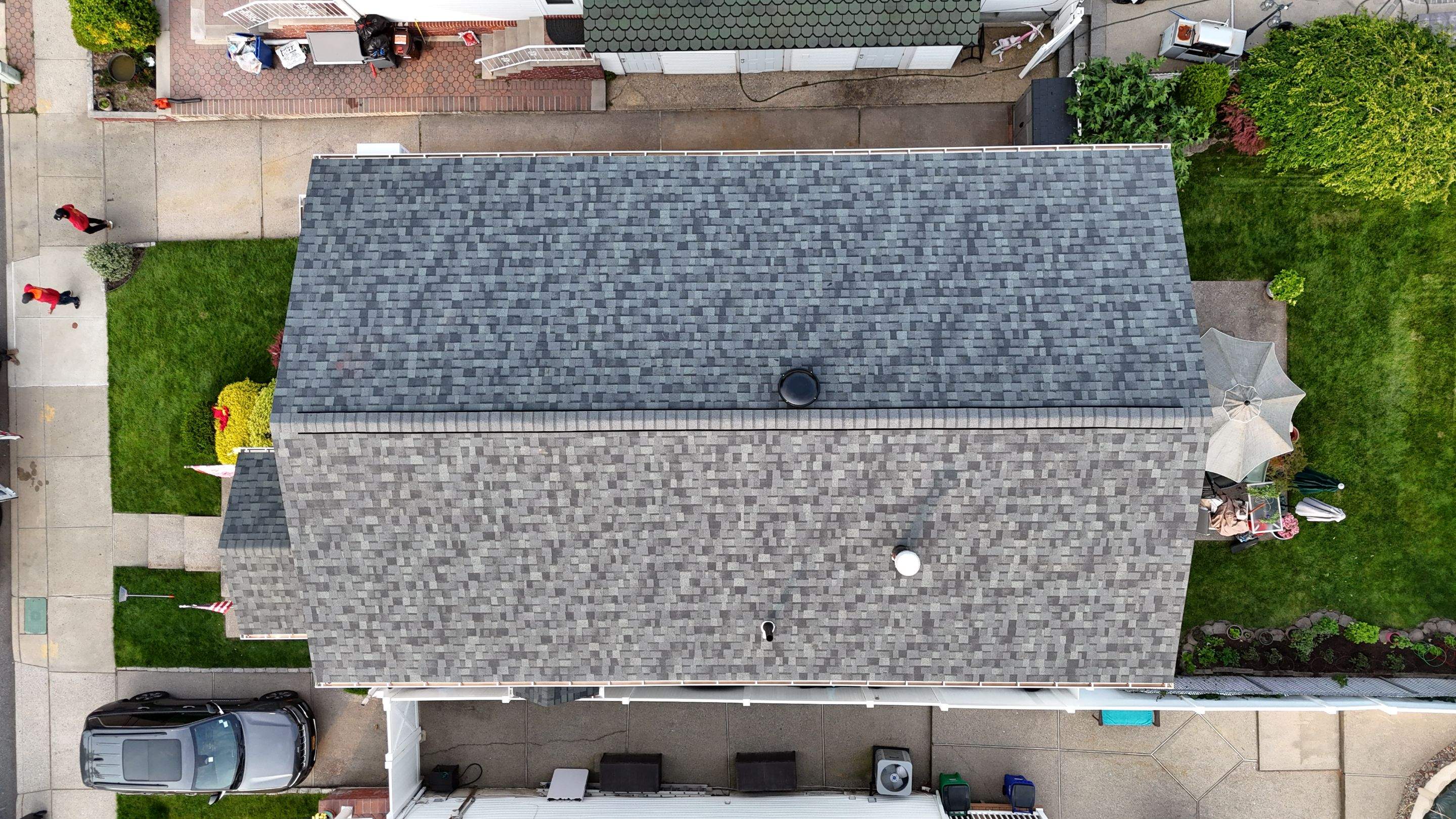 Roof replacement completed in Staten Island, NY. Featuring Owen's Corning TruDefinition Duration in Estate Gray. New 5" K Style Seamless Gutter and downspout in white