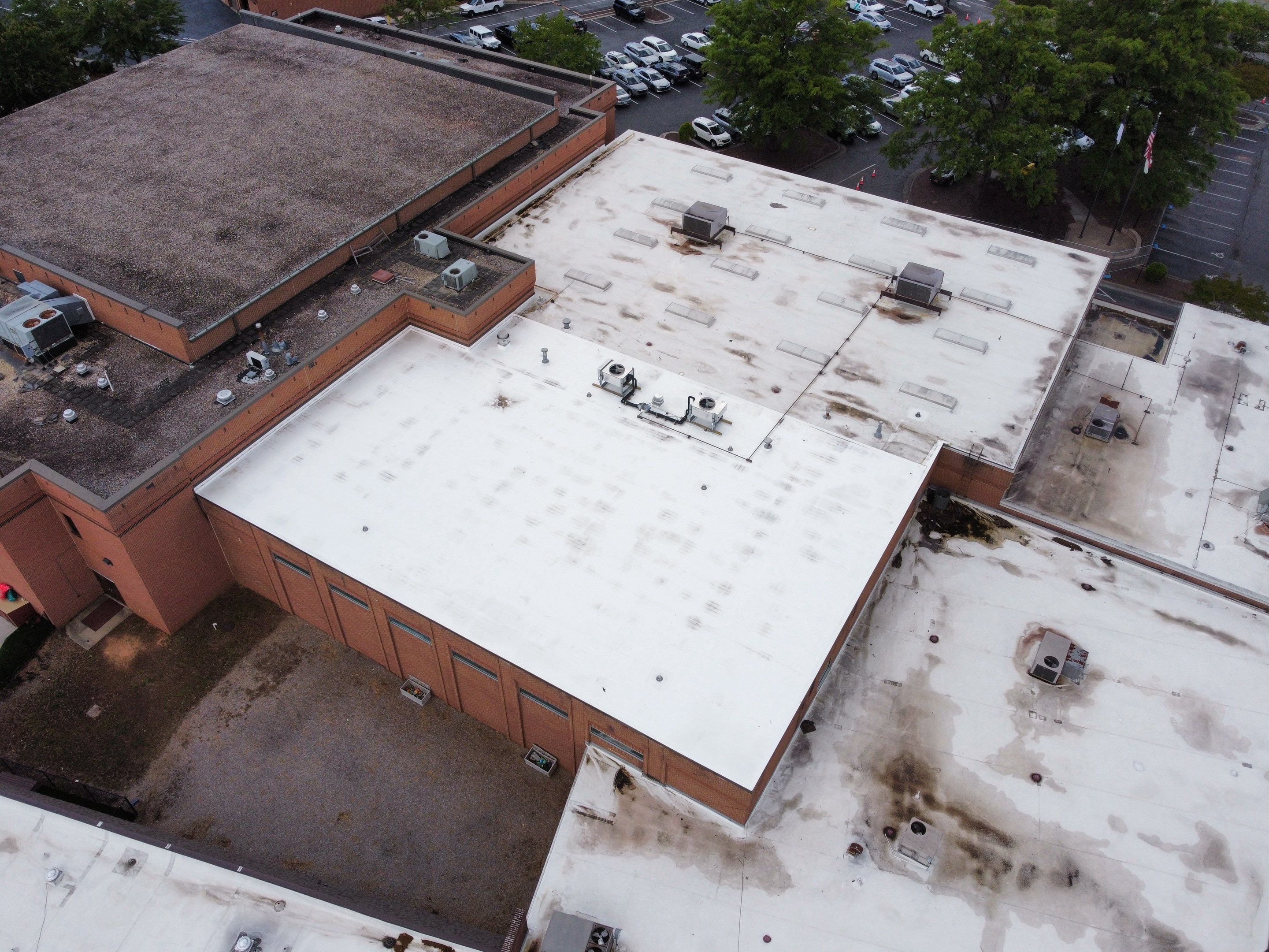 Removal of existing roof system over an active swimming pool. Installation of new vapor barrier, adhered insulation, and adhered PVC roofing membrane.