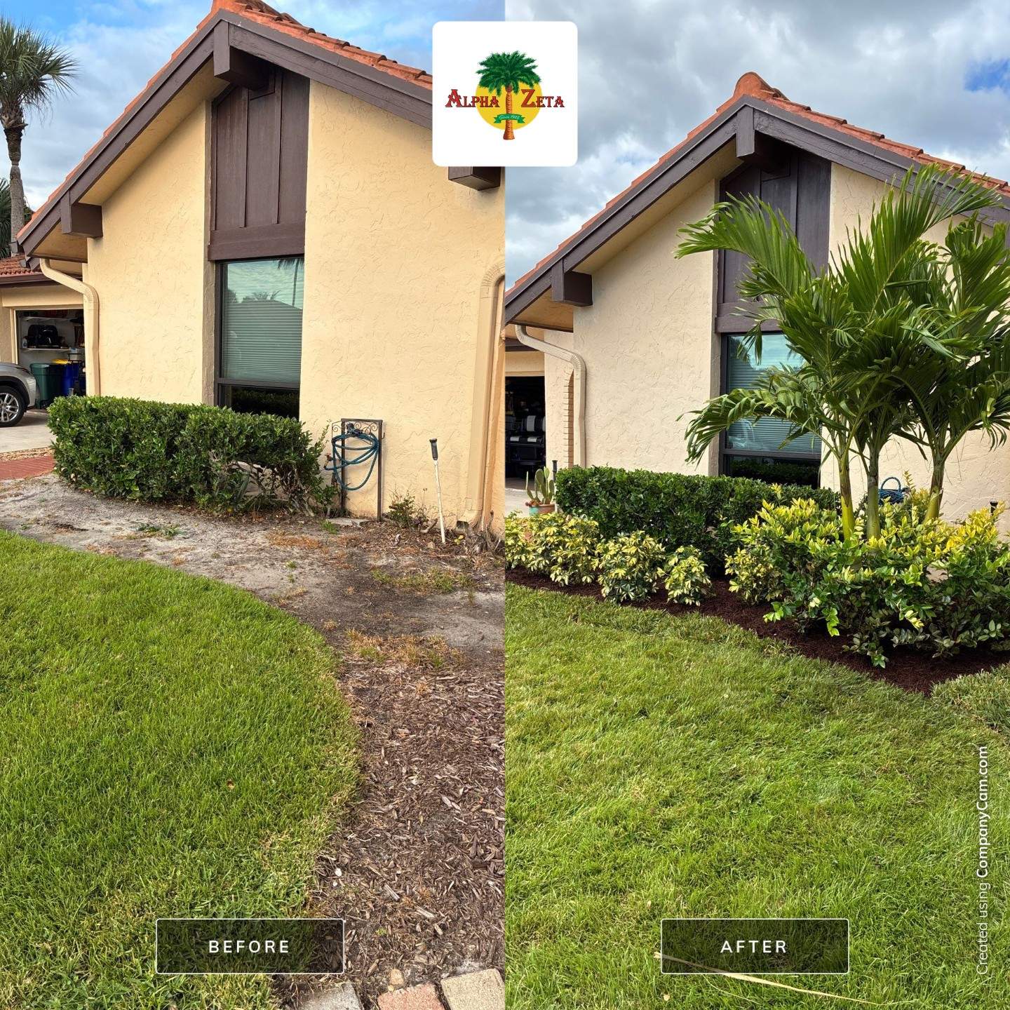 From tired and underwhelming to fresh, balanced, and inviting — this front entry transformation at Ibis Point captures what a clean design and professional touch can do. Our team at Alpha Zeta Landscapes reimagined the space with vibrant Tri-color Arboricola and Ligustrum layers, accented by a striking Double Christmas Palm that brings vertical balance and tropical flair. A crisp mulch bed, clean grass edge, and refined plant symmetry deliver instant curb appeal — the perfect welcome home.