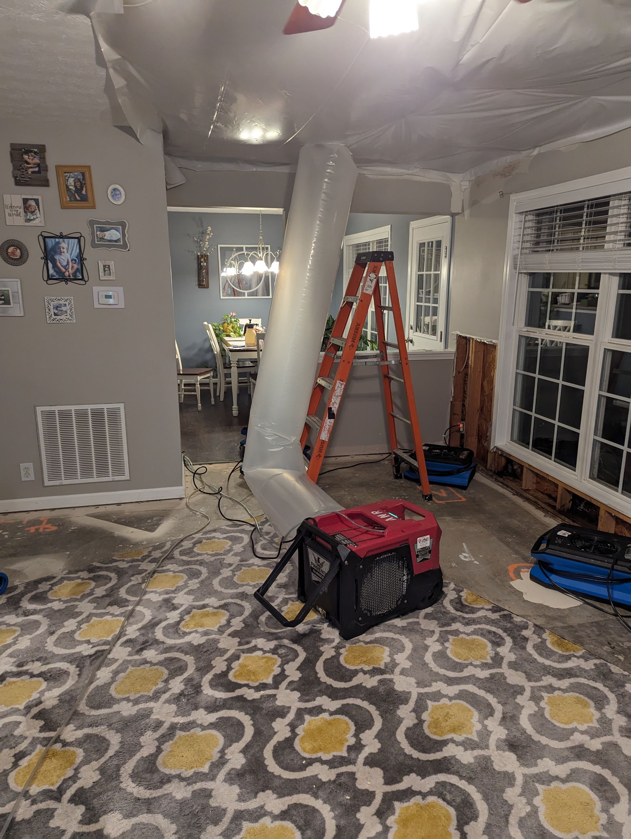 24/7 emergency services in a residential home in Louisville, KY. This customer called ANR Restoration after a toilet backup caused an overflow that leaked through the ceiling and caused water damage. ANR Restoration is proud to offer 24/7 emergency service water mitigation and was able to start the dry out after hours. ANR demoed out the saturated flooring and set air movers and dehumidifiers in the space, as well as creating a drying funnel through to the ceiling to dry out the area. ANR Restoration is grateful to help put people back together no matter the time of day or night!