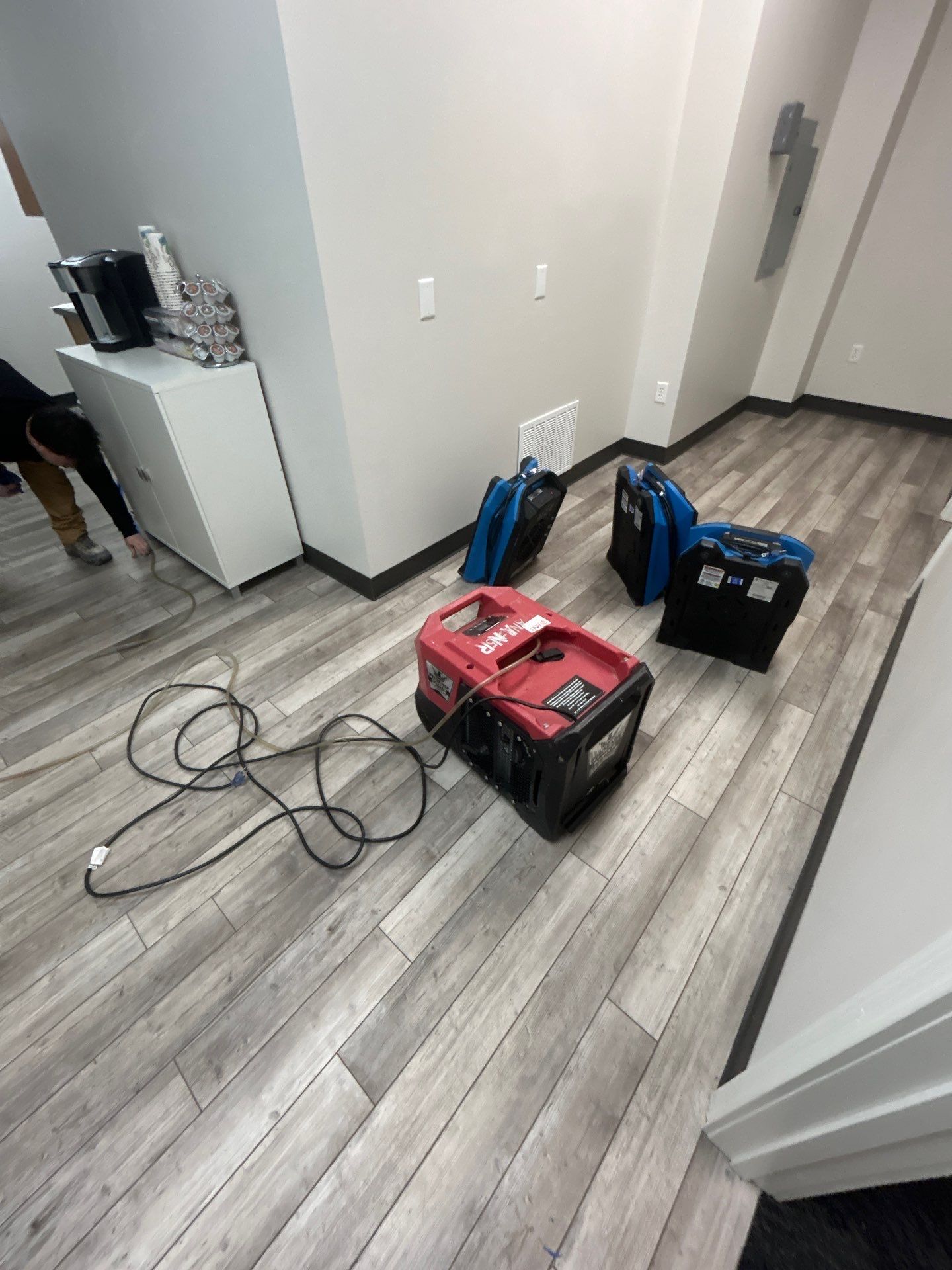 Commercial emergency service water mitigation in Jeffersonville, IN. After their sprinkler system had crashed and caused water damage throughout the building, we quickly arrived to start mitigation. The first step was to extract the standing water that was throughout. Next, we sat air movers and dehumidifiers to effectively dry out the space. We also checked the drywall, ceiling and flooring with moisture meters and thermal cameras to see how we were coming along during the drying process. Once the areas reached dry standard, mitigation was complete! Thank you for trusting ANR Restoration with your commercial mitigation!