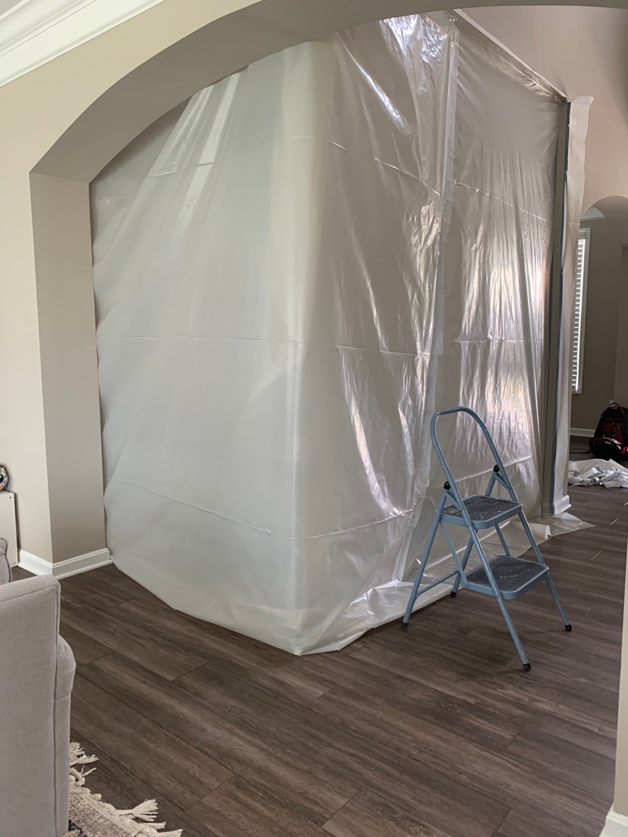 Mold remediation in Louisville, KY. We found water spots/damage to the ceiling on the main floor from a possible leak in the upstairs bathroom. We first assessed the damage on site by using moisture meters to determine the extent of the damage to the drywall. The next day, we started our mold remediation by setting up containments to block off the affected area from the rest of the home and started demoing out the moldy drywall. We also set air movers and dehumidifiers in the space to purify the air from mold spores/humidity to help dry the space out. For the repairs portion, we were able to completely revamp the bathroom space! Adding new beautiful shower doors and fresh new layers of paint in order to give this space a special final touch!