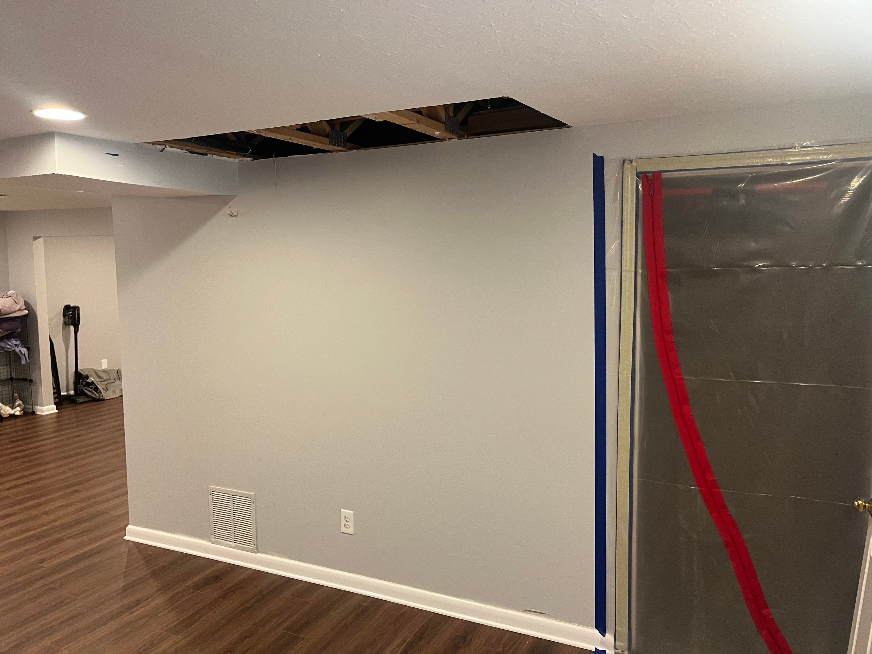 Mold remediation and repairs in Crestwood, KY. Our client had some concerns of mold in their laundry room from a previous leak years ago. After noticing musty odors and seeing visible staining on the ceiling, ANR Restoration was called out for the remediation, as well as repairs. We demoed out the affected ceiling and drywall throughout the laundry room and parts of the living area and set up containments so that the mold spores would not transfer throughout the home. Our crew got geared up in our PPE and started work by applying antimicrobial solutions to the studs, walls, etc. and by using our HEPA vacuum to extract all mold spores from those affected areas. Once mold remediation was complete, repairs began by patching up all the drywall work that had been demoed out. Finally, we added fresh coats of paint to complete the job. Thank you for trusting ANR Restoration with your remediation and repairs!