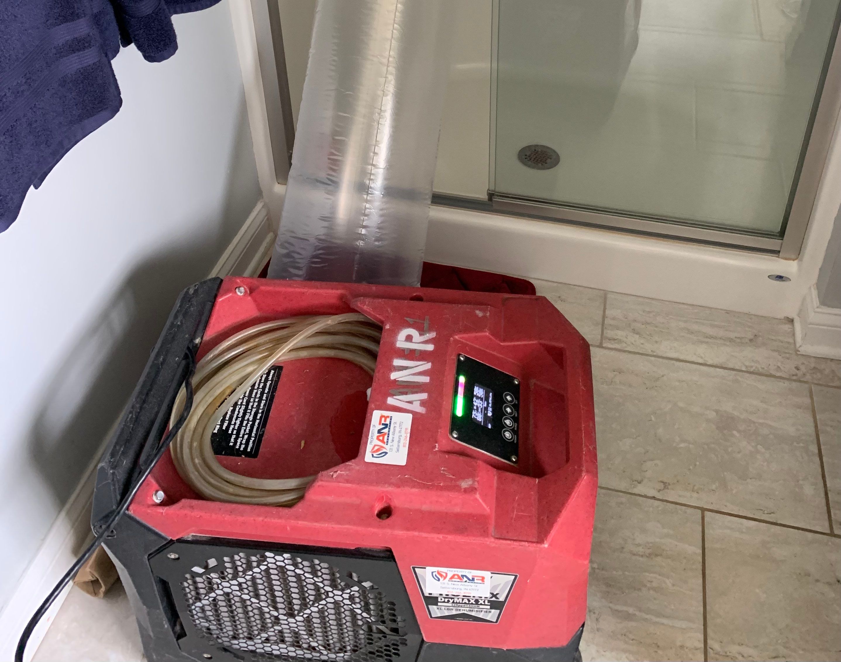Water damage dryout/mitigation in a bathroom ceiling in Louisville, KY. The ceiling in the bathroom was discolored and leaking water from around the vent fan. We started our mitigation process by drying out the moisture from the air in the bathroom by utilizing our dehumidifiers.