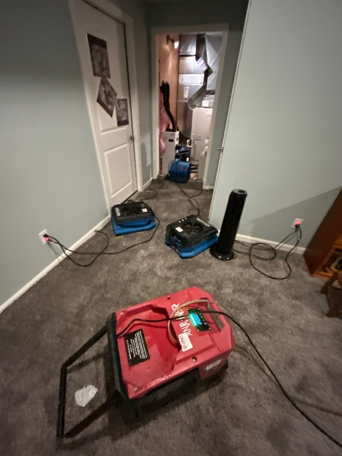 Emergency service water mitigation for a repeat customer in Pekin, IN. We've done previous water mitigation and repair services for our client before and were grateful they trusted us once again for this project! Water intrusion caused a small amount of damage in the home. We were able to come onsite after assessing the damages and start mitigation. Our crew had to pull up the existing saturated carpet in order to properly dry the space out underneath. We applied antimicrobial solutions, as well, to ensure a safe a disinfected area. We are always happy to help our clients whatever the situation!