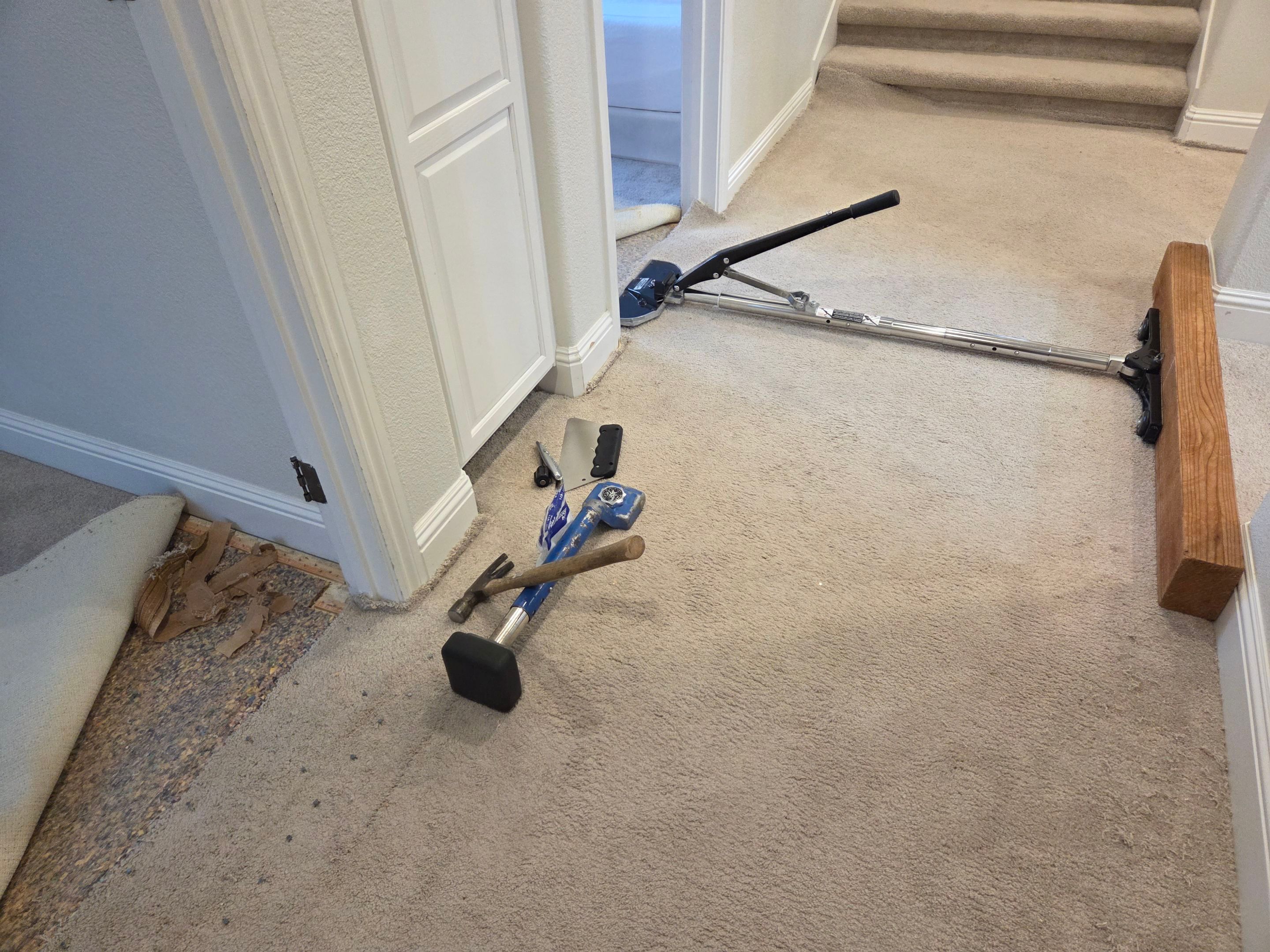 The carpet in this hallway and a couple of bedrooms became buckled. We were called out to fix the carpet. We ended up opening a couple of seams in the hallway carpet, re-stretching it, and using "stay-nails" to keep it under tension during the seam reconstruction. We had to move and manipulate furniture in two bedrooms to re-stretch those rooms as well.
