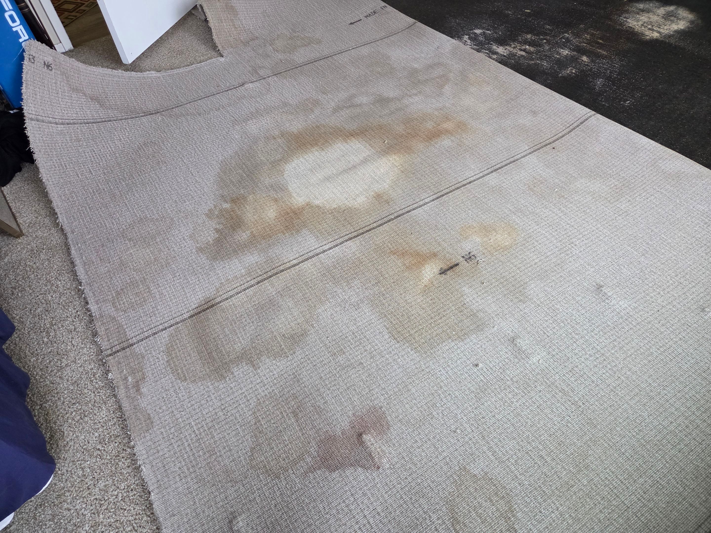 The carpet had urine deeply embedded in the backing, cushion, and subfloor. The homeowners were looking for an improvement, not perfection, as they wanted to buy some time with this carpet. Due to the severity of the issue, we pulled the carpet back and removed the existing cushion. Next, we applied an odor counteractant to the substrate and wiped it down before installing a new, matching cushion. We laid a tarp, placed the carpet back, and performed a urine flush of the carpet backing using a subsurface extraction tool. Once that was completed, we reinstalled the carpet and performed standard cleaning in this room and another.