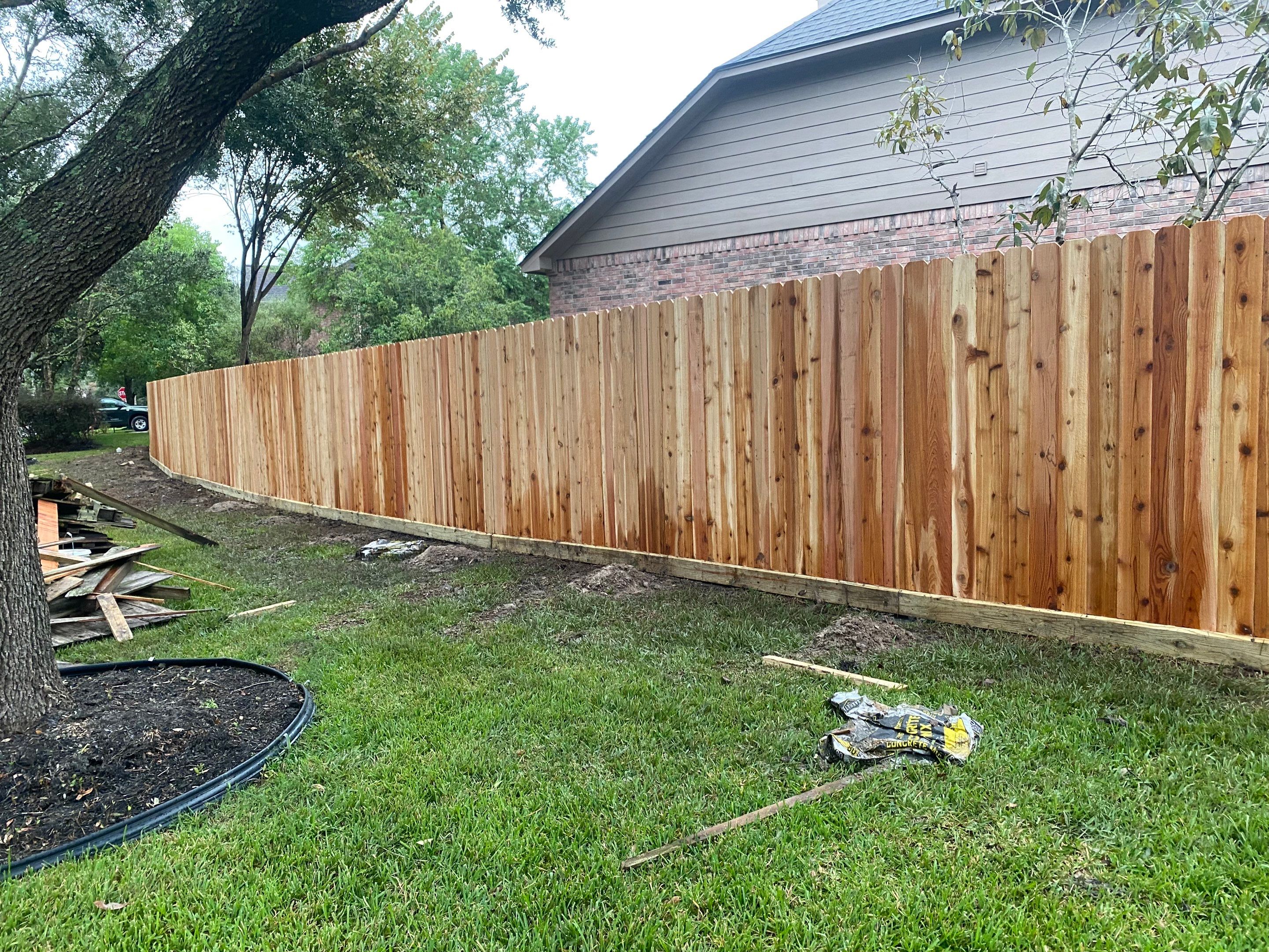 Western Red Cedar, 2x6 pressure treated baseboard, 4x4x8 pressure treated post, #80 bag of concrete, Fence Installation