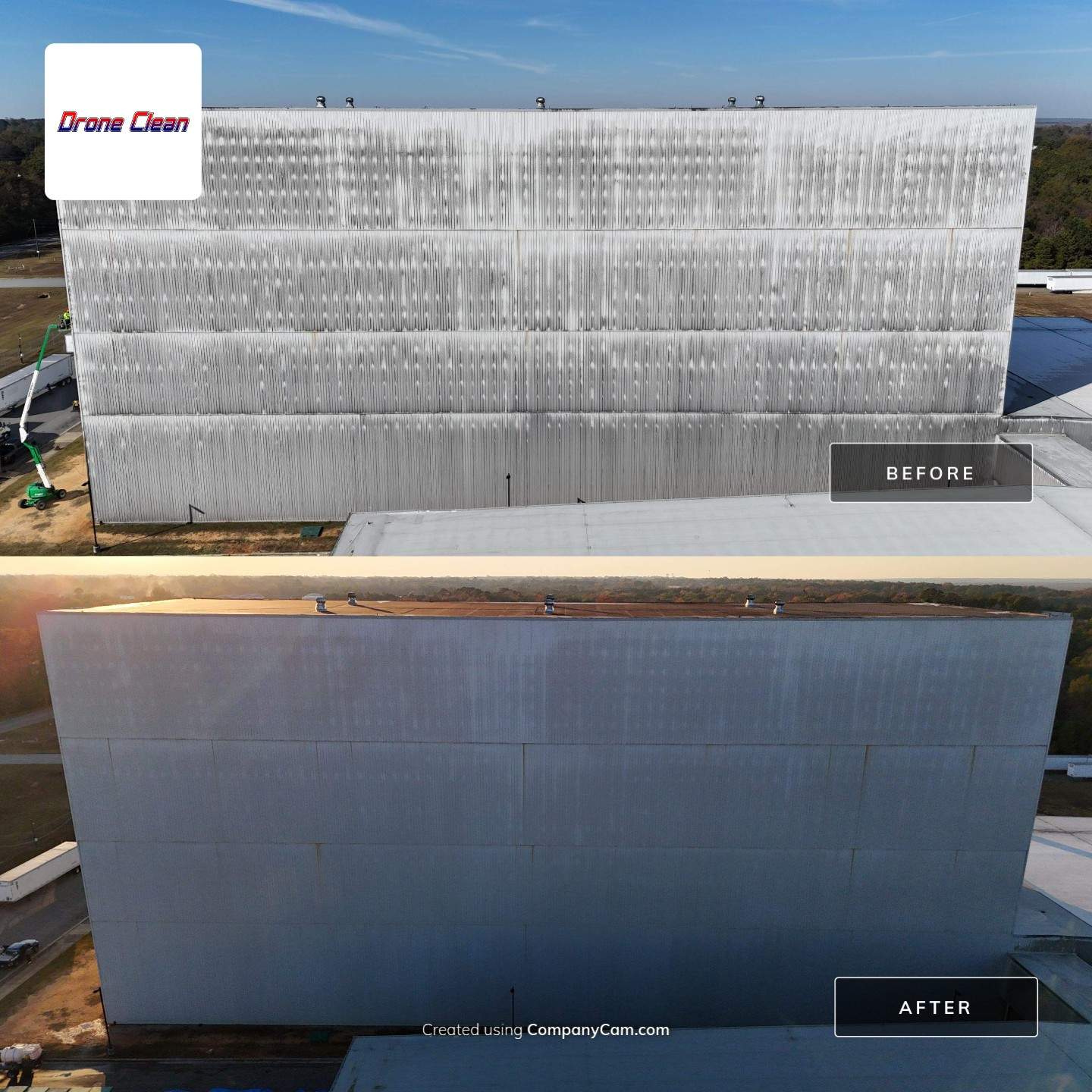 Organic stain removal on a metal building for Kuhmo tire, a manufacturing site. We completed this project using two drone teams and one lift team in a timeline of only 2 days in order to execute a short term request.