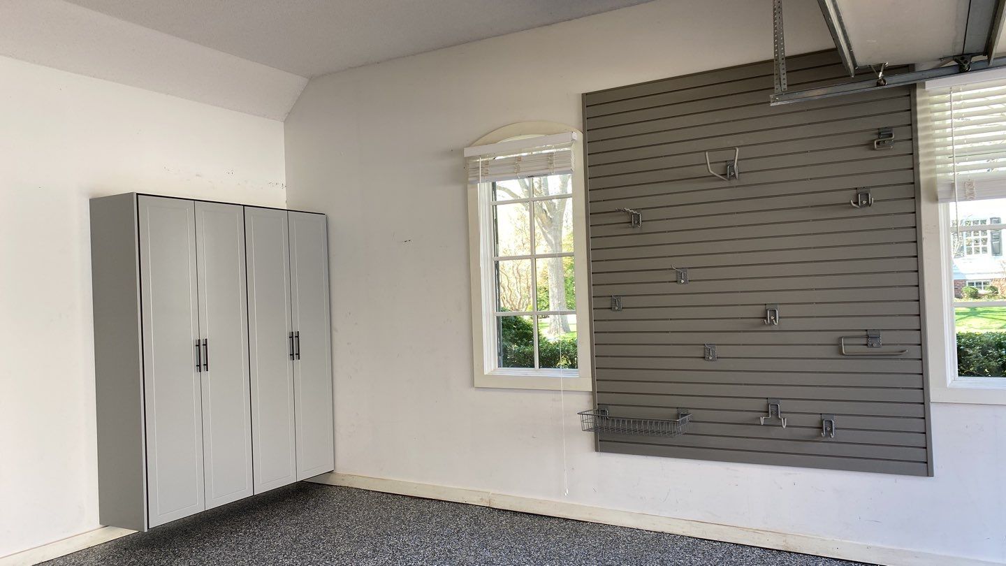 Banner Garage Floor, BG Floor: "Banner Blue", Redline GarageGear Cabinets, RLGG Cabinets: "Dove Grey" Powder Coated, Heavy Duty Slotwall, SW HD Slatwall: "Weathered Grey", Garage Addition, Garage Remodel, Garage Upgrade, Garage Wall Storage, Flooring Installation, Cabinet Installation