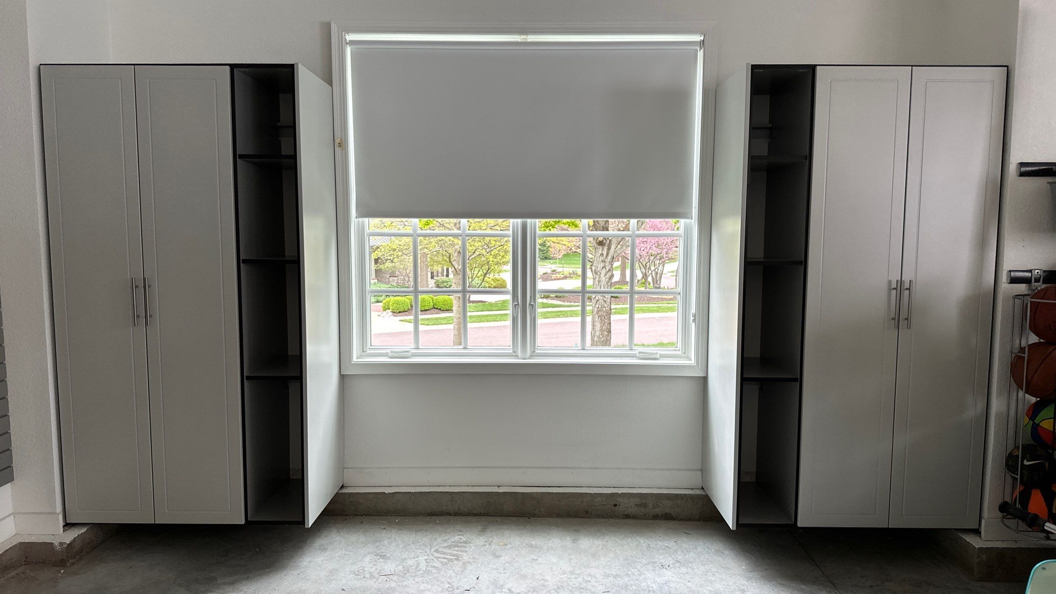 Redline GarageGear Cabinets, Heavy Duty Slotwall, SW HD Slatwall: "Weathered Grey", RLGG Cabinets: "Dove Grey" Powder Coated, RLGG Door/Drawer Style: Reverse Bead (Shaker), Racks: 2'x8' White Ceiling Rack, Garage Upgrade, Garage Renovation