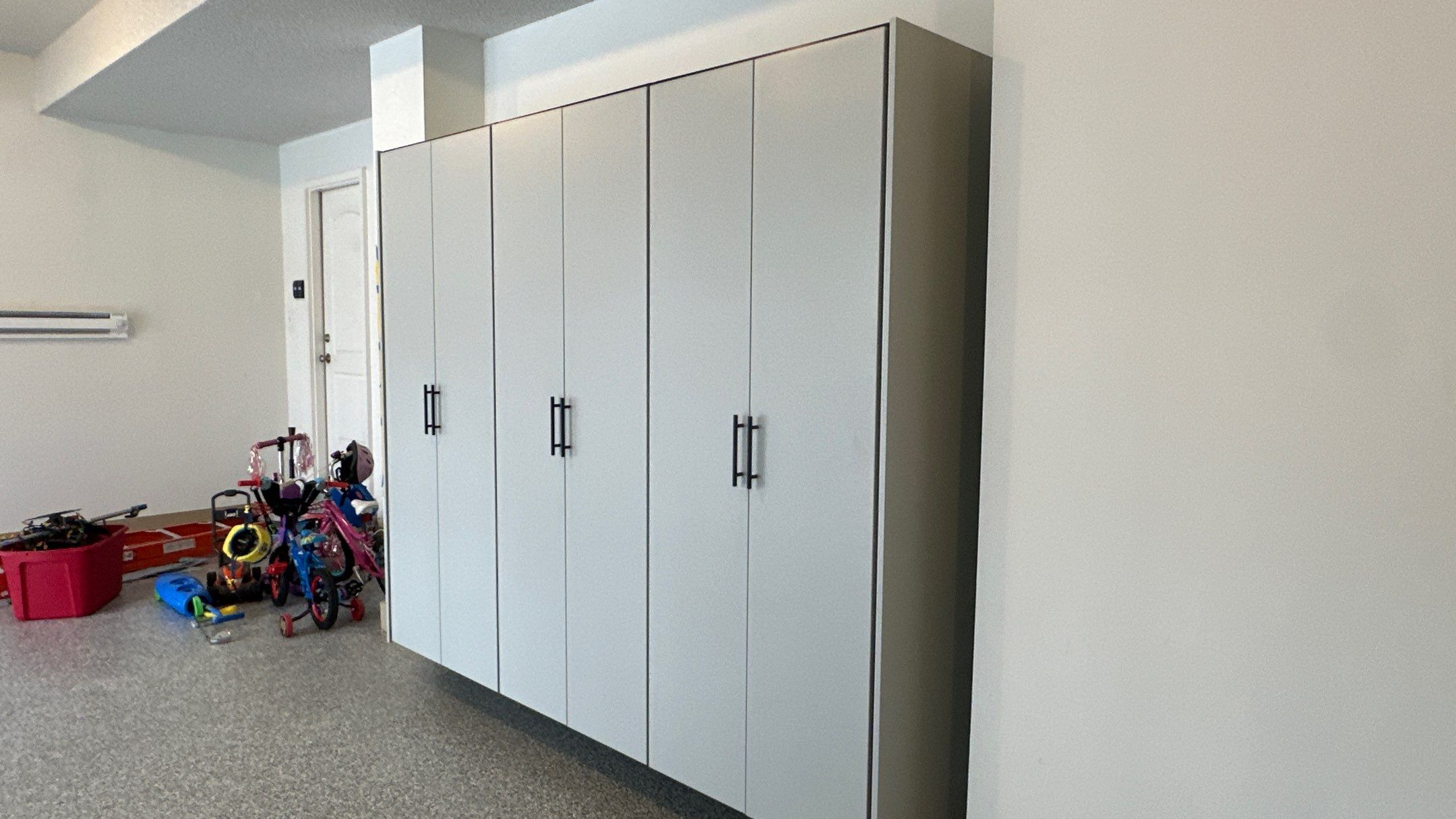 Heavy Duty Slotwall, RLGG Cabinets: "Platinum" Powder Coated, RLGG Door/Drawer Style: Reverse Bead (Shaker), SW HD Slatwall: "Whitewood", Specialty "Black" HD Workbench/Countertop, Redline GarageGear Cabinets, Garage Remodel, Garage Renovation, Garage Upgrade, Garage Wall Storage
