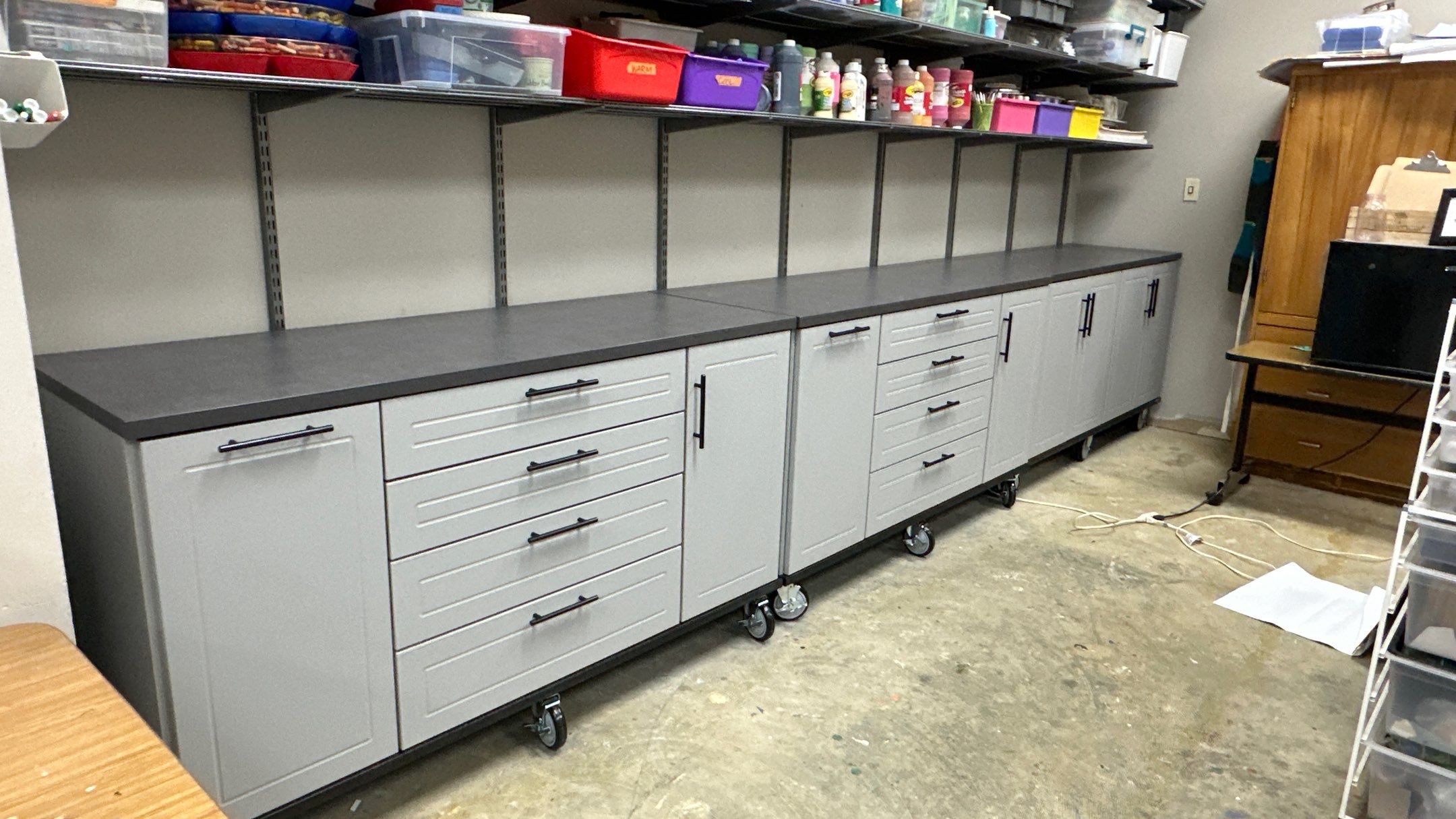 Specialty "Black" HD Workbench/Countertop, Cabinet Installation, RLGG Cabinets: "Dove Grey" Powder Coated