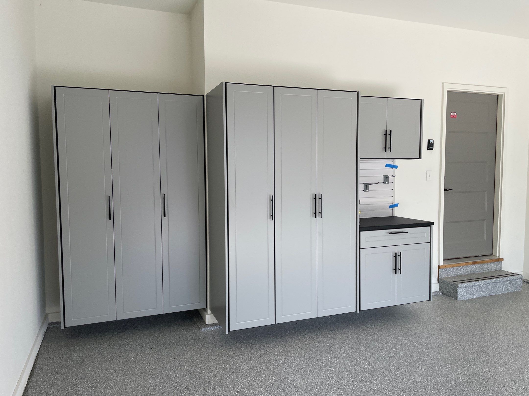SW HD Slatwall: "Whitewood", Specialty "Black" HD Workbench/Countertop, RLGG Cabinets: "Dove Grey" Powder Coated, Redline GarageGear Cabinets, Heavy Duty Slotwall, Garage Addition, Garage Upgrade, Garage Wall Storage, Cabinet Installation