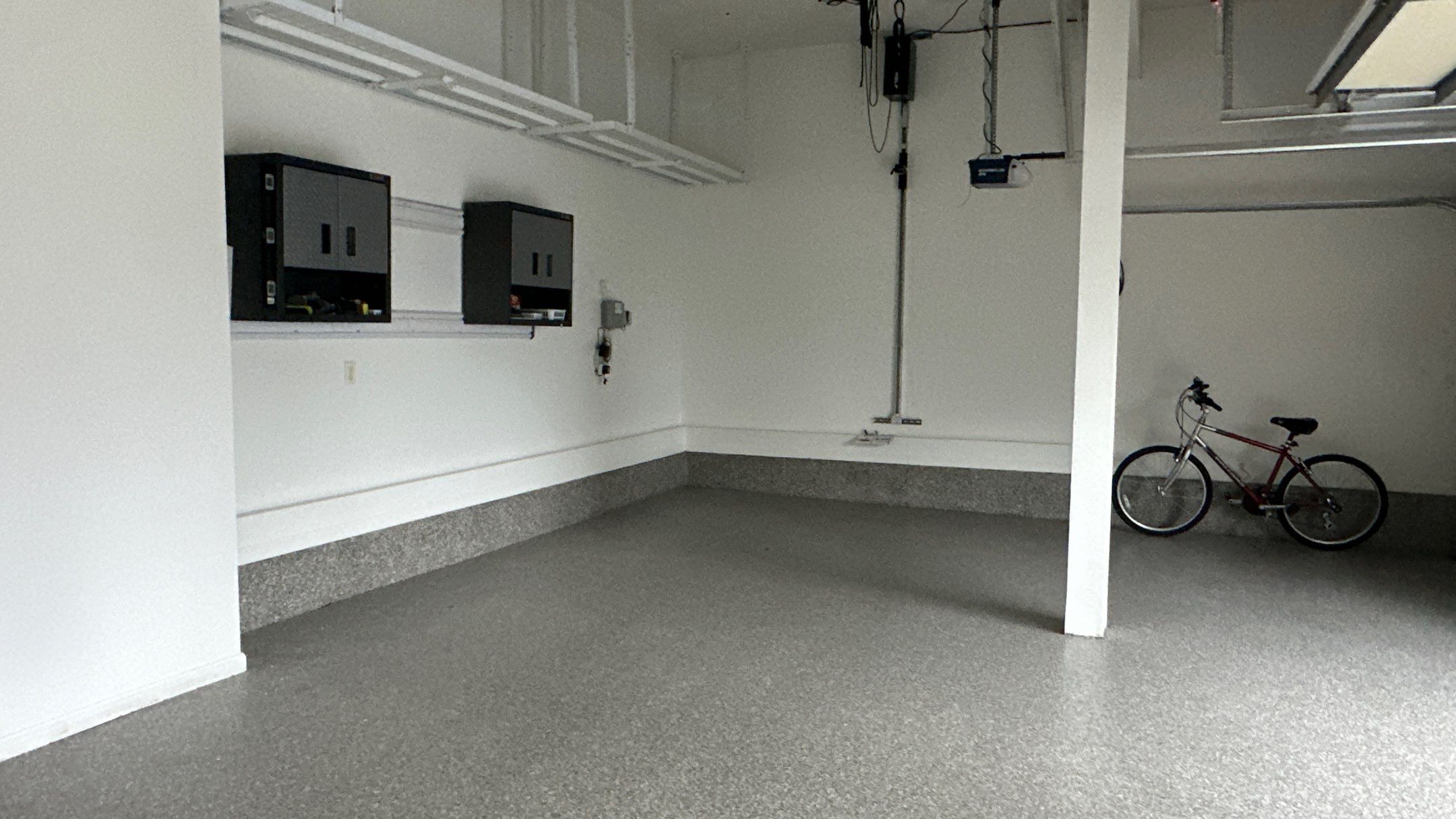 BG Floor: "Creekbed", Banner Garage Floor, Heavy Duty Slotwall, Racks: 2'x8' White Ceiling Rack, Racks: 4'x8' White Ceiling Rack, SW HD Slatwall: "Barnwood Grey", Garage Remodel, Garage Renovation, Garage Upgrade, Garage Wall Storage