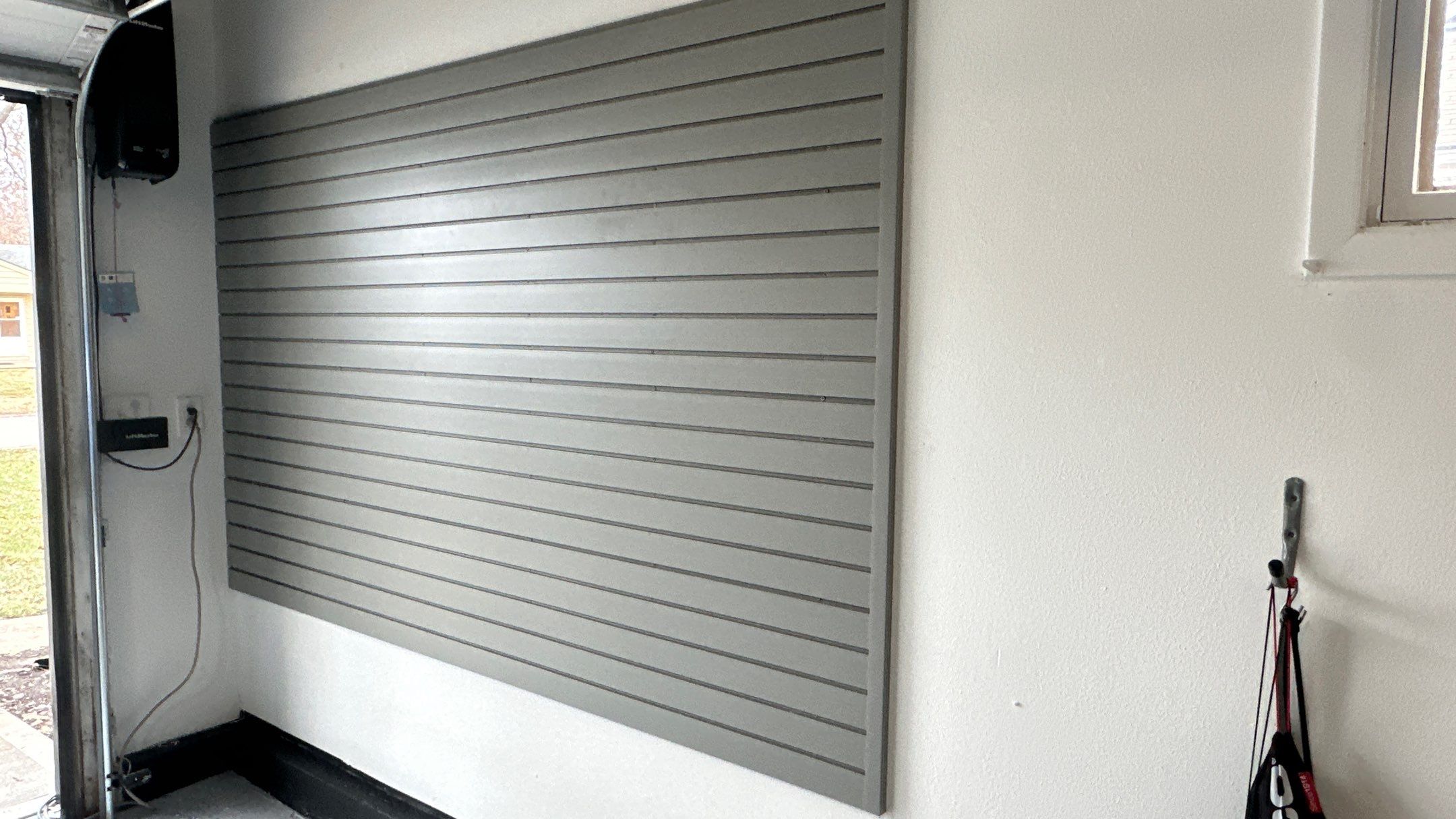 Heavy Duty Slotwall, Racks: 4'x8' White Ceiling Rack, SW HD Slatwall: "Weathered Grey", Garage Remodel, Garage Upgrade, Garage Wall Storage