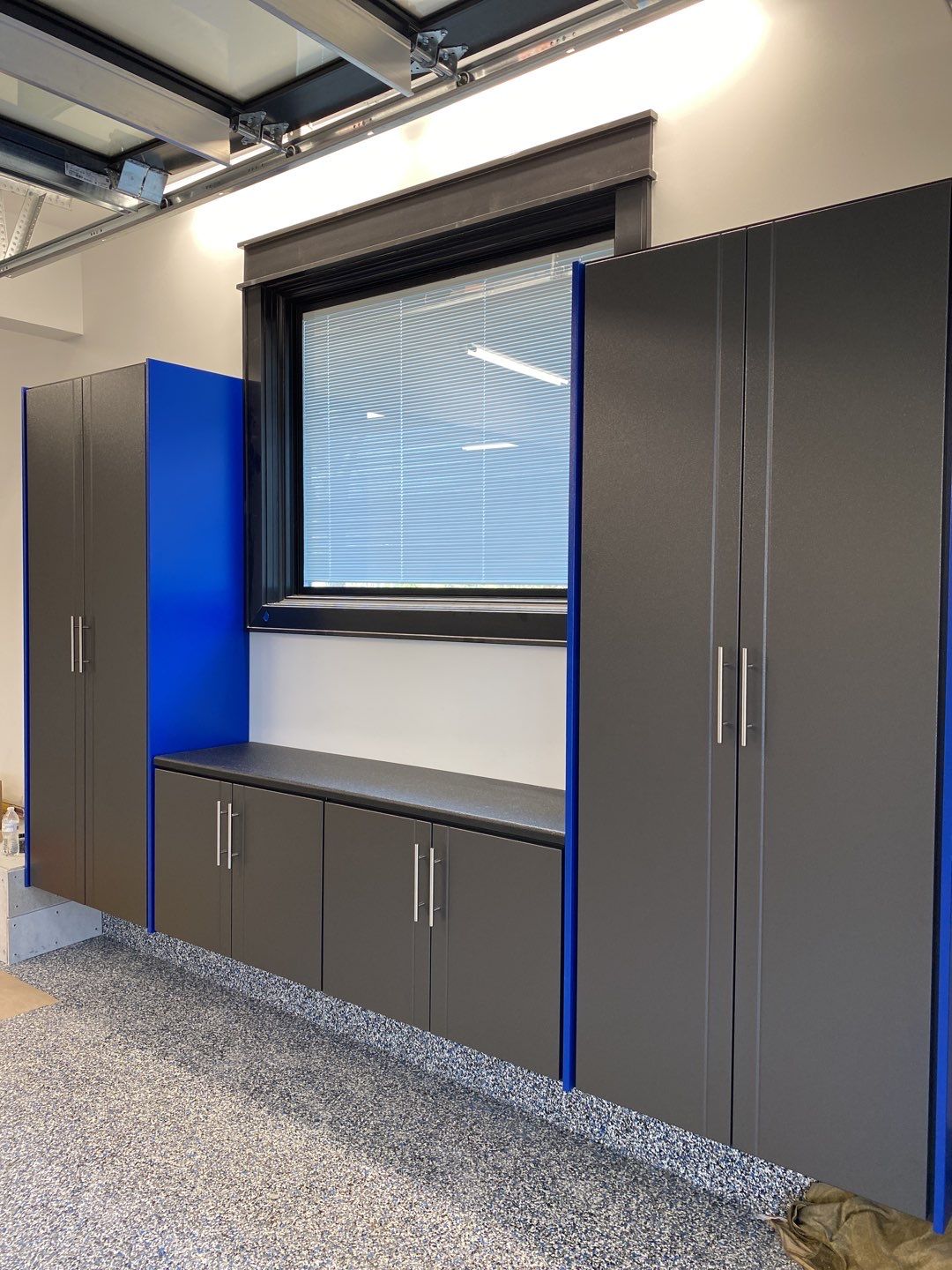 Banner Garage Floor, BG Floor: "Banner Blue", Redline GarageGear Cabinets, RLGG Cabinets: "Pewter" Powder Coated, RLGG Cabinets: "Royal Blue" Powder Coated, Flooring Installation, Cabinet Installation, Garage Addition, Garage Remodel, Garage Renovation, Garage Upgrade