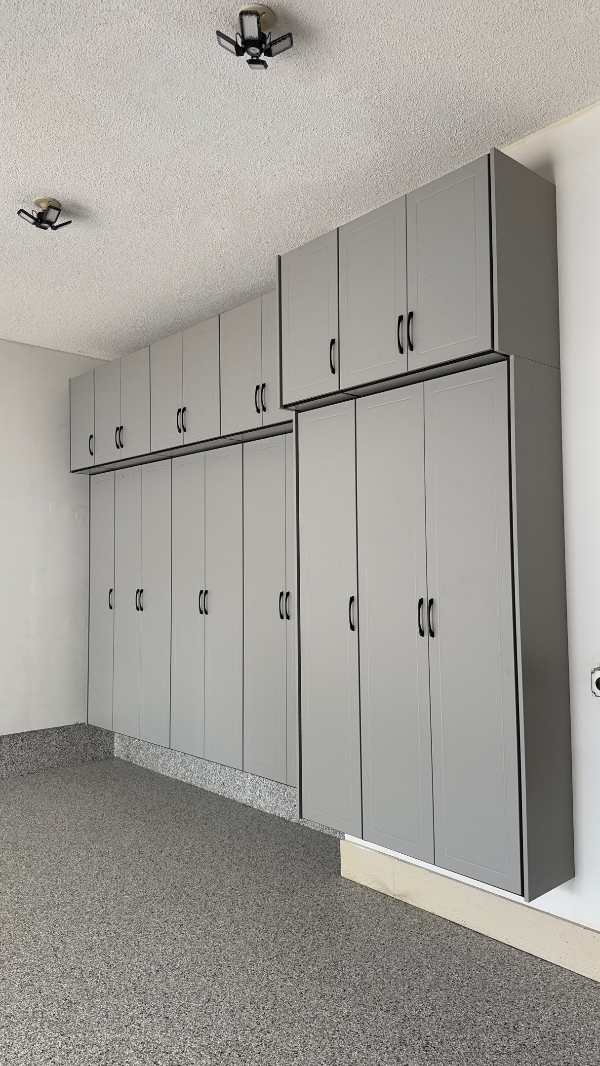 BG Floor: "Coyote", Banner Garage Floor, RLGG Cabinets: "Dove Grey" Powder Coated, RLGG Door/Drawer Style: Reverse Bead (Shaker), Redline GarageGear Cabinets, Specialty "Black" HD Workbench/Countertop, MKE SW: "Textured Grey", Double Stack, Garage Remodel, Garage Renovation, Garage Upgrade, Garage Wall Storage