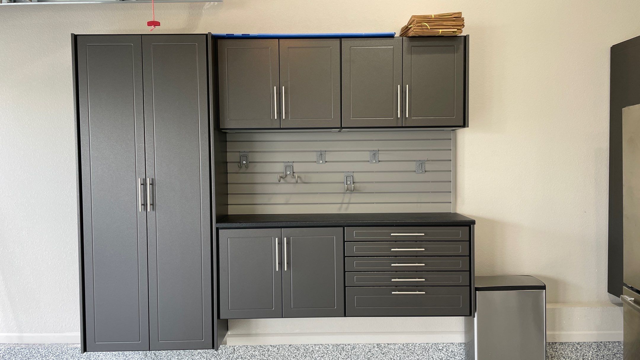 Racks: 4'x8' White Ceiling Rack, Heavy Duty Slotwall, SW HD Slatwall: "Weathered Grey", Redline GarageGear Cabinets, RLGG Cabinets: "Pewter" Powder Coated, Specialty "Black" HD Workbench/Countertop, Garage Upgrade, Garage Addition, Garage Remodel, Garage Wall Storage, Cabinet Installation
