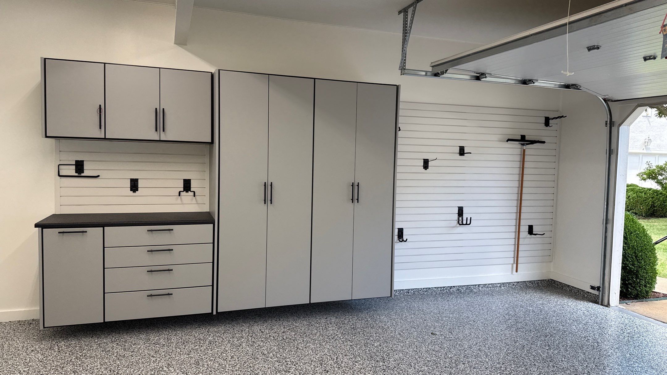 Banner Garage Floor, MKE SW: "Textured White", MKE Slatwall, RLGG Cabinets: "Dove Grey" Melamine, Specialty "Black" HD Workbench/Countertop, Garage Remodel, Garage Renovation, Garage Upgrade, Garage Wall Storage, BG Floor: "Domino"