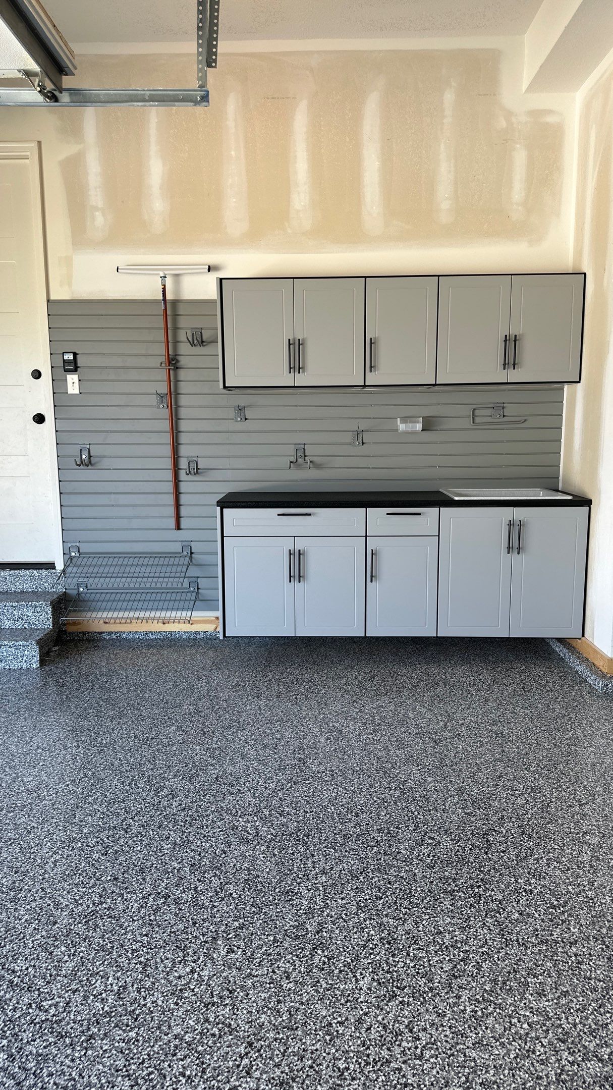 BG Floor: "Banner", Banner Garage Floor, Heavy Duty Slotwall, RLGG Cabinets: "Dove Grey" Powder Coated, RLGG Door/Drawer Style: Reverse Bead (Shaker), Racks: 4'x8' White Ceiling Rack, Redline GarageGear Cabinets, SW HD Slatwall: "Weathered Grey", Specialty "Black" HD Workbench/Countertop, Specialty Cabinet: Sink, Garage Remodel, Garage Renovation, Garage Upgrade, Garage Wall Storage