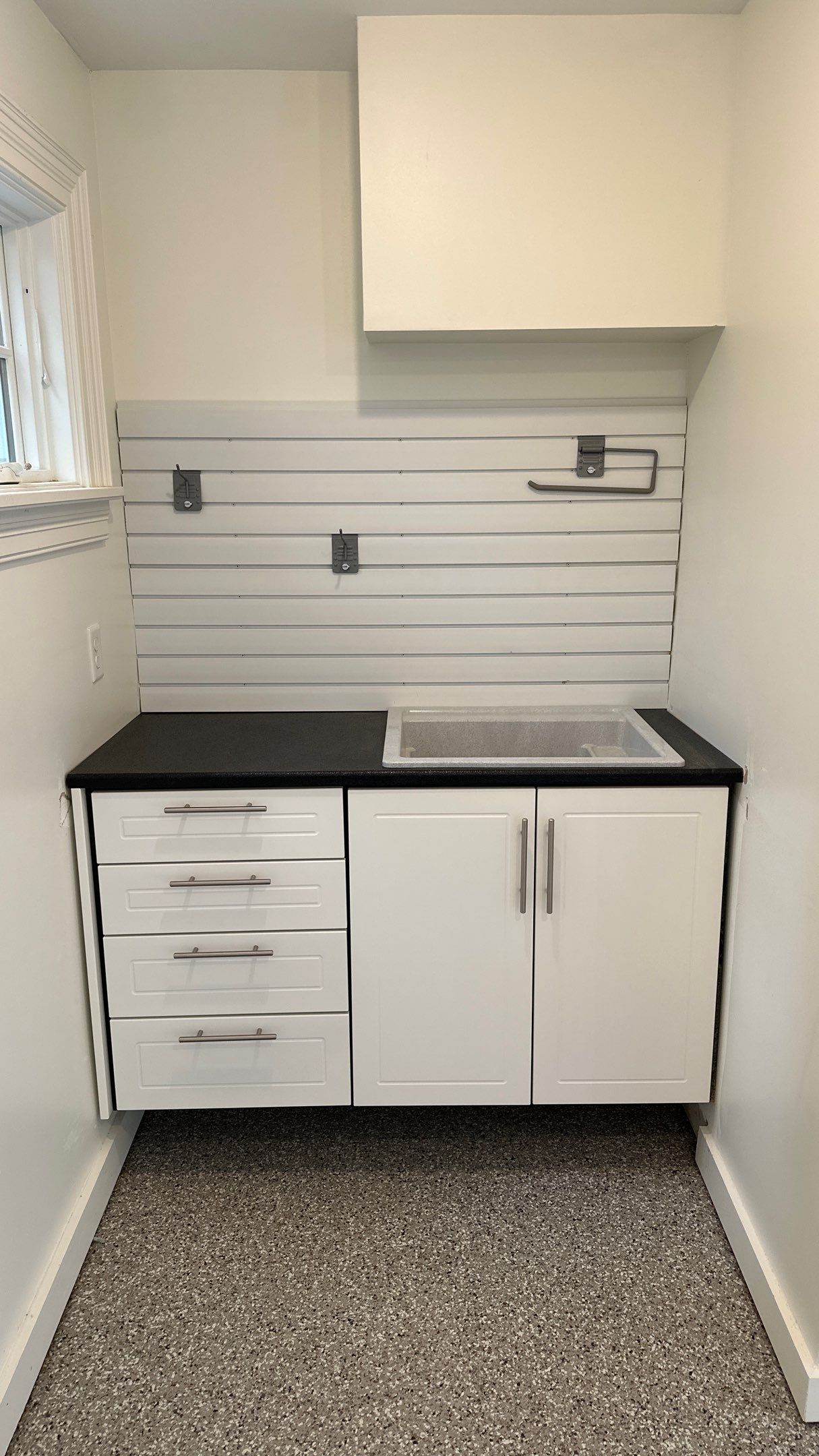 Redline GarageGear Cabinets, Heavy Duty Slotwall, RLGG Cabinets: "Frosty White" Powder Coated, SW HD Slatwall: "Brite White", Specialty "Black" HD Workbench/Countertop, Specialty Cabinet: Sink, RLGG Door/Drawer Style: Reverse Bead (Shaker), Garage Remodel, Garage Upgrade