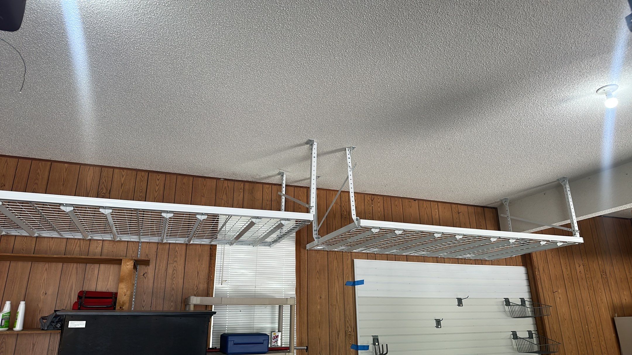 SW HD Slatwall: "Brite White", Racks: 4'x8' White Ceiling Rack, Specialty: Hoist Lift, Garage Upgrade