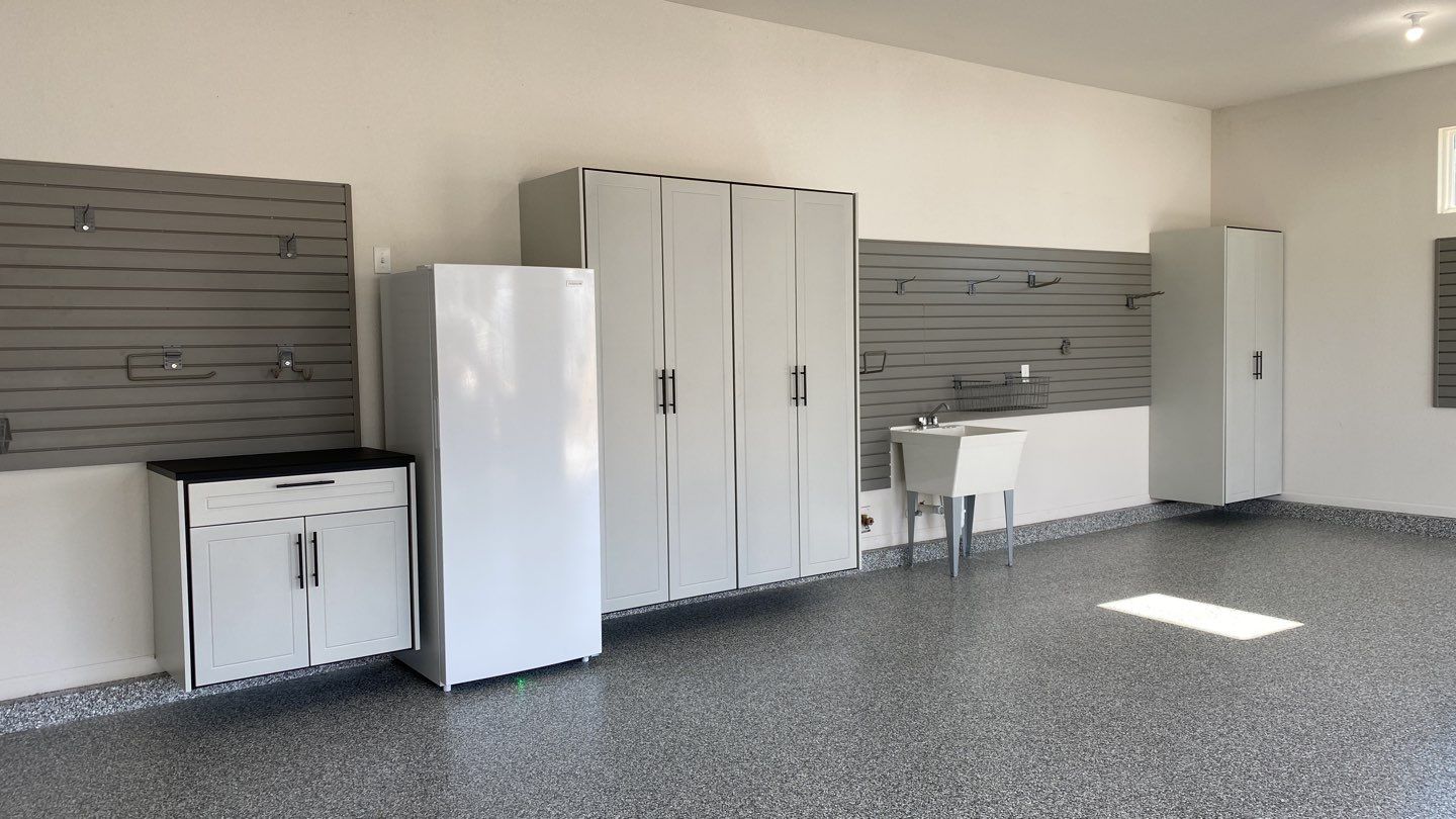Redline GarageGear Cabinets, RLGG Cabinets: "Platinum" Powder Coated, Banner Garage Floor, BG Floor: "Stonehenge", Racks: 4'x8' Hammertone Ceiling Rack, Heavy Duty Slotwall, SW HD Slatwall: "Weathered Grey", Cabinet Installation, Flooring Installation, Garage Wall Storage, Garage Addition, Garage Remodel, Garage Upgrade