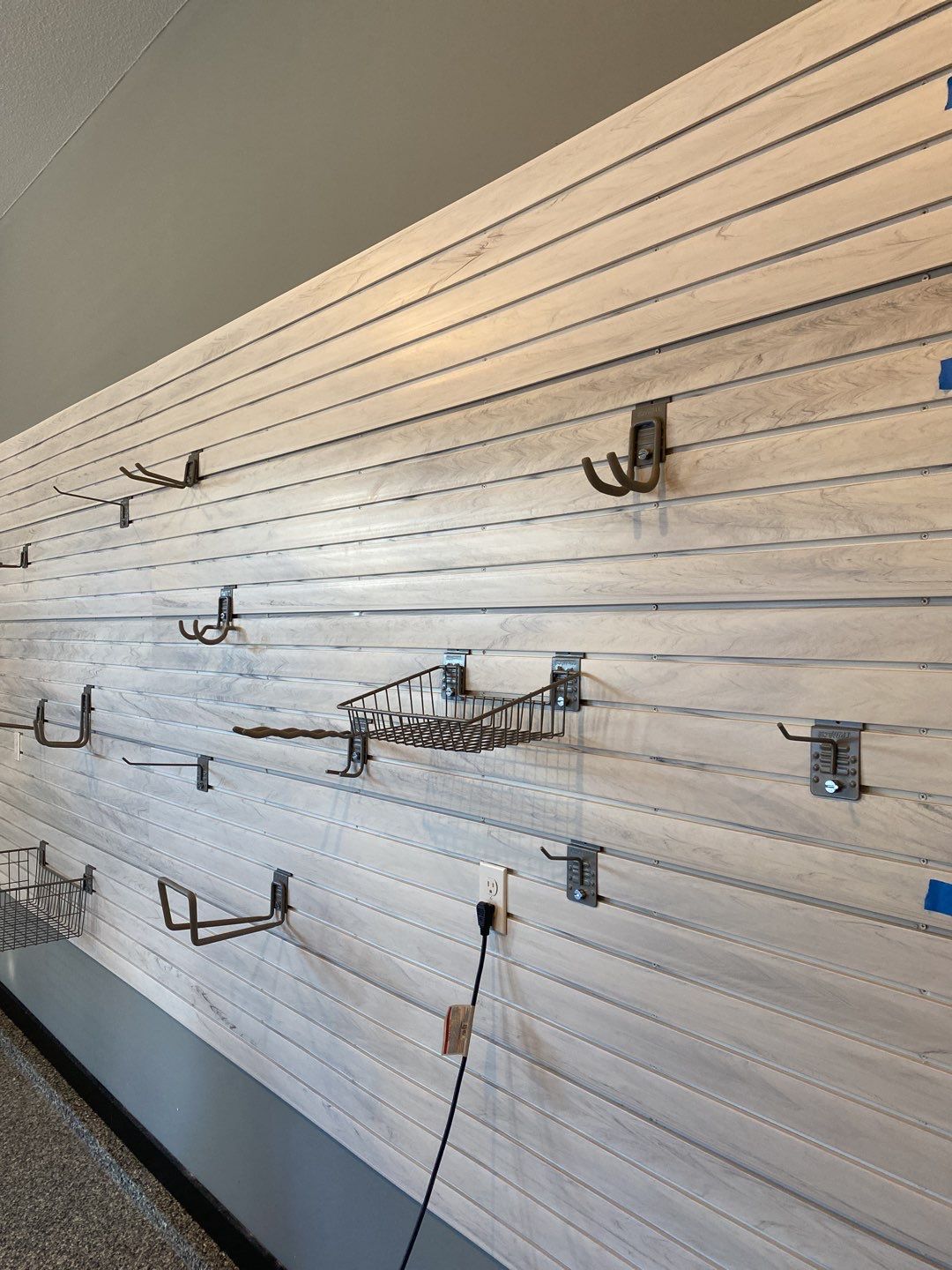 Kevin upgrades his garage in Lenexa, Kansas with "Whitewood" Heavy Duty Slotwall storage. We only use top-of-the-line Heavy Duty Slotwall. We have tried many different brands of slotwall, and have learned this is the best slotwall money can buy. All the accessories have 1/4" turn cam lock holding the accessory in place. There are six colors to choose from and this project includes "Whitewood" color slotwall. Each panel is 96" wide by 15" tall are combined in this project to make a 16' wide x 6.25' tall section on the back wall of his garage.
