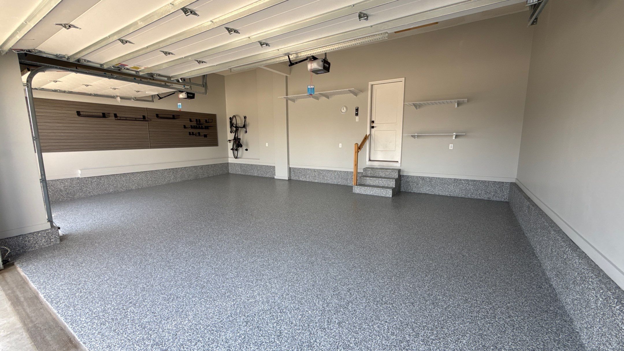 BG Floor: "Stonehenge", Banner Garage Floor, Bike Storage: SteadyRacks, Heavy Duty Slotwall, MKE SW: Barnwood, MKE Slatwall, Garage Remodel, Garage Renovation, Garage Upgrade, Garage Wall Storage