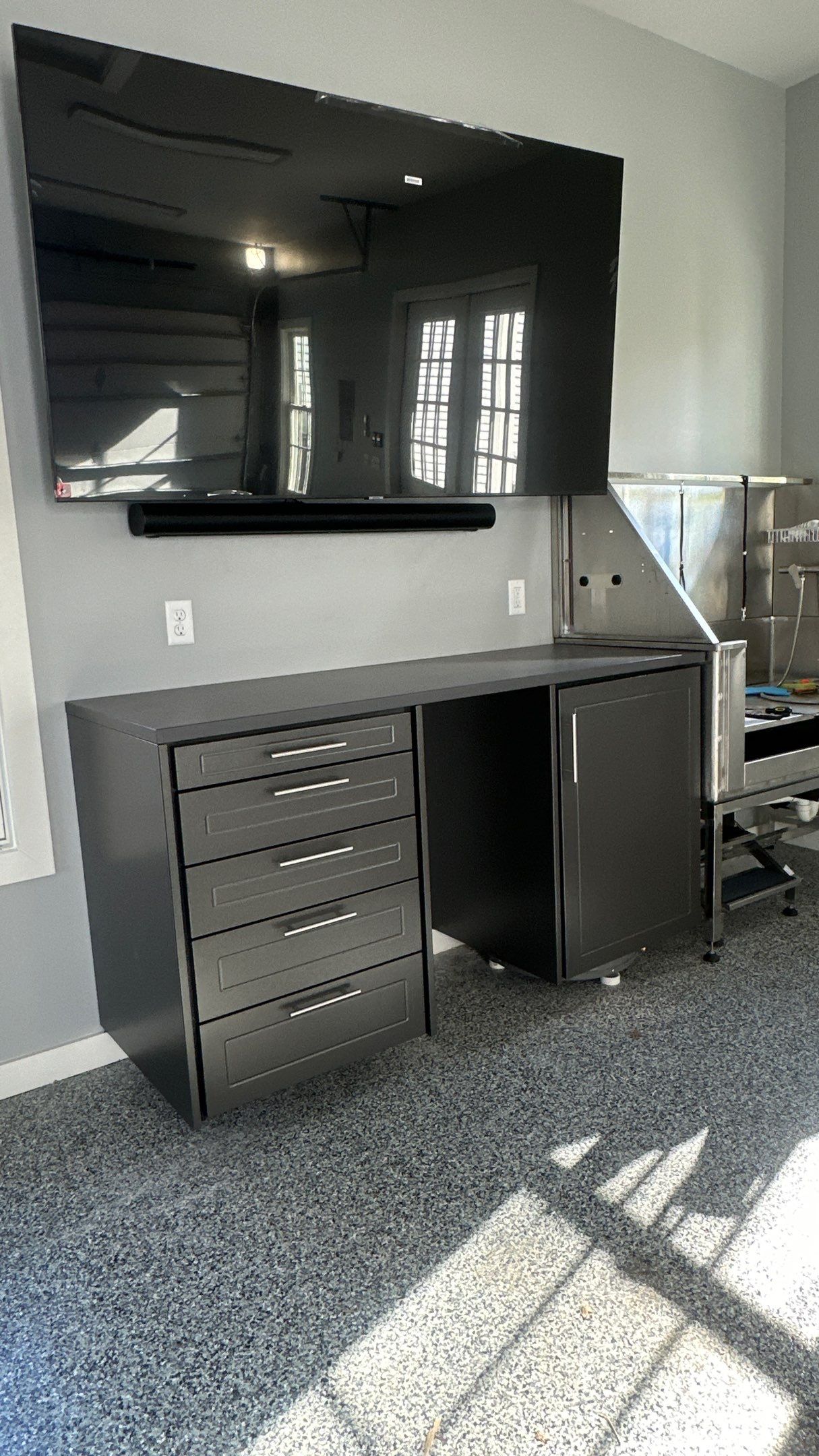 RLGG Cabinets: "Pewter" Powder Coated, RLGG Door/Drawer Style: Reverse Bead (Shaker), Redline GarageGear Cabinets, Specialty "Black" HD Workbench/Countertop, Garage Remodel, Garage Renovation, Garage Upgrade, Garage Wall Storage