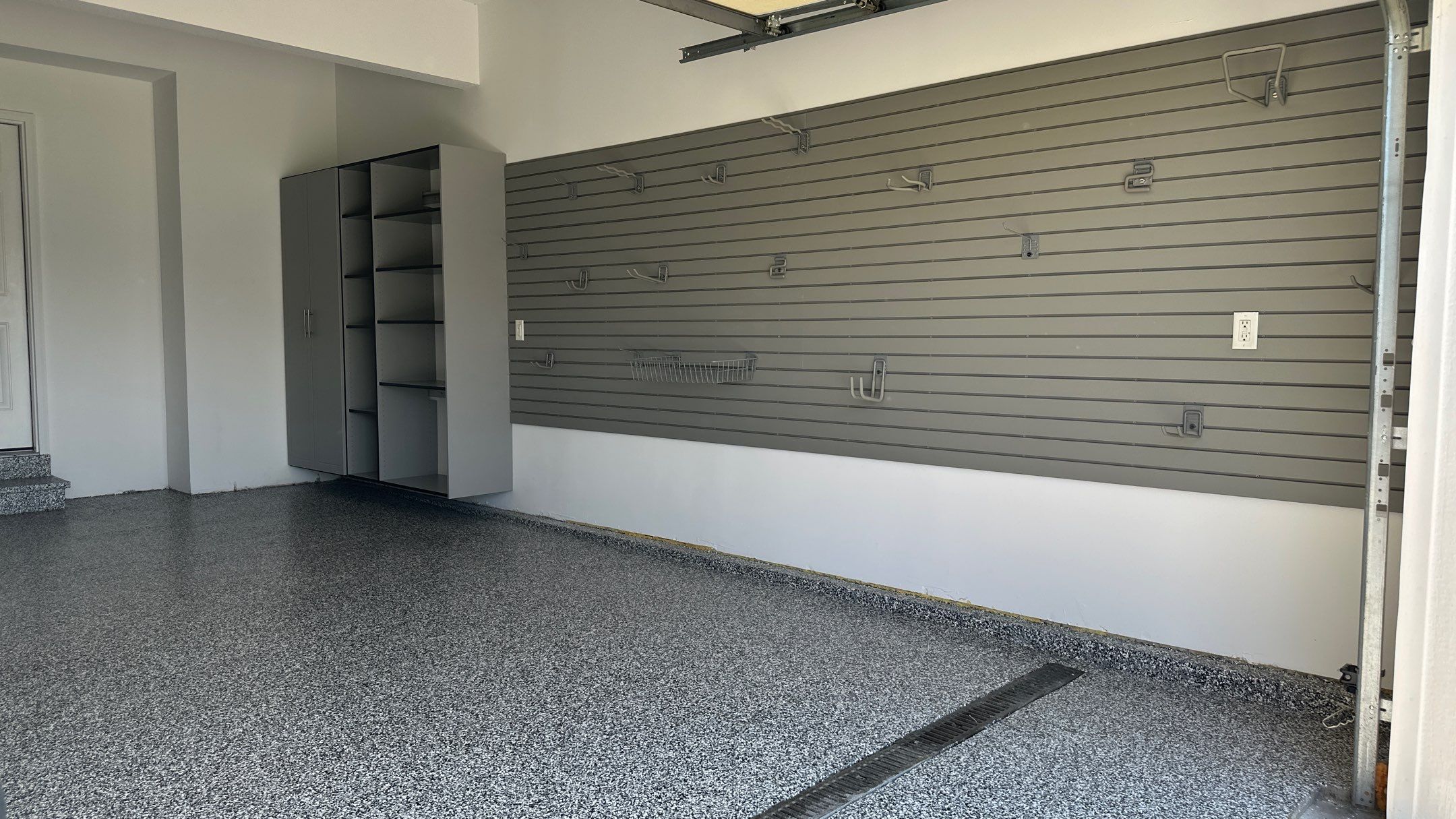 BG Floor: "Banner", Banner Garage Floor, Heavy Duty Slotwall, RLGG Cabinets: "Dove Grey" Powder Coated, RLGG Door/Drawer Style: Reverse Bead (Shaker), Redline GarageGear Cabinets, SW HD Slatwall: "Weathered Grey", Garage Remodel, Garage Renovation, Garage Upgrade, Garage Wall Storage
