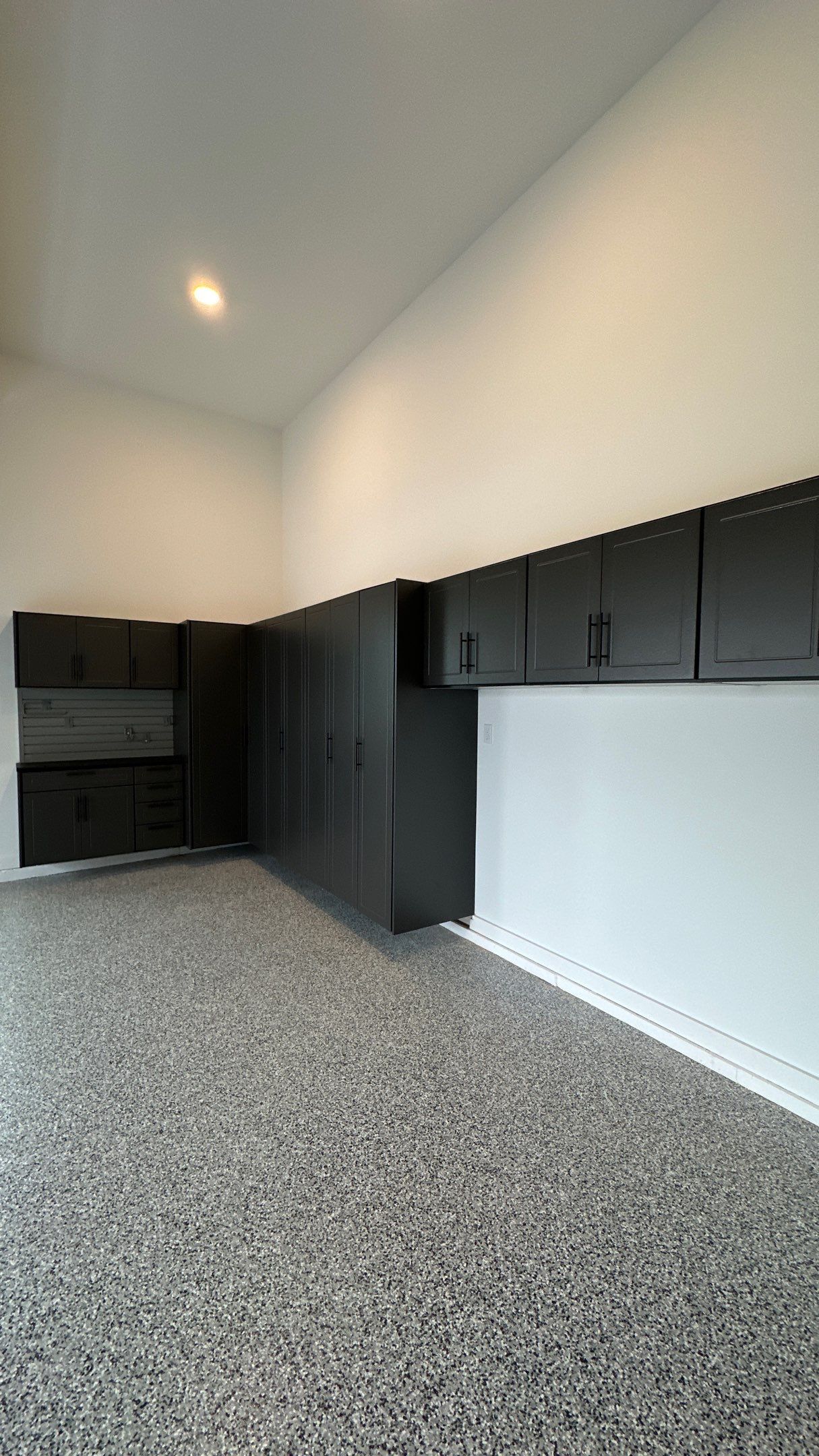 Redline GarageGear Cabinets, Heavy Duty Slotwall, RLGG Cabinets: "Black" Powder Coated, SW HD Slatwall: "Weathered Grey", Specialty "Black" HD Workbench/Countertop, RLGG Door/Drawer Style: Reverse Bead (Shaker), Garage Remodel, Garage Upgrade
