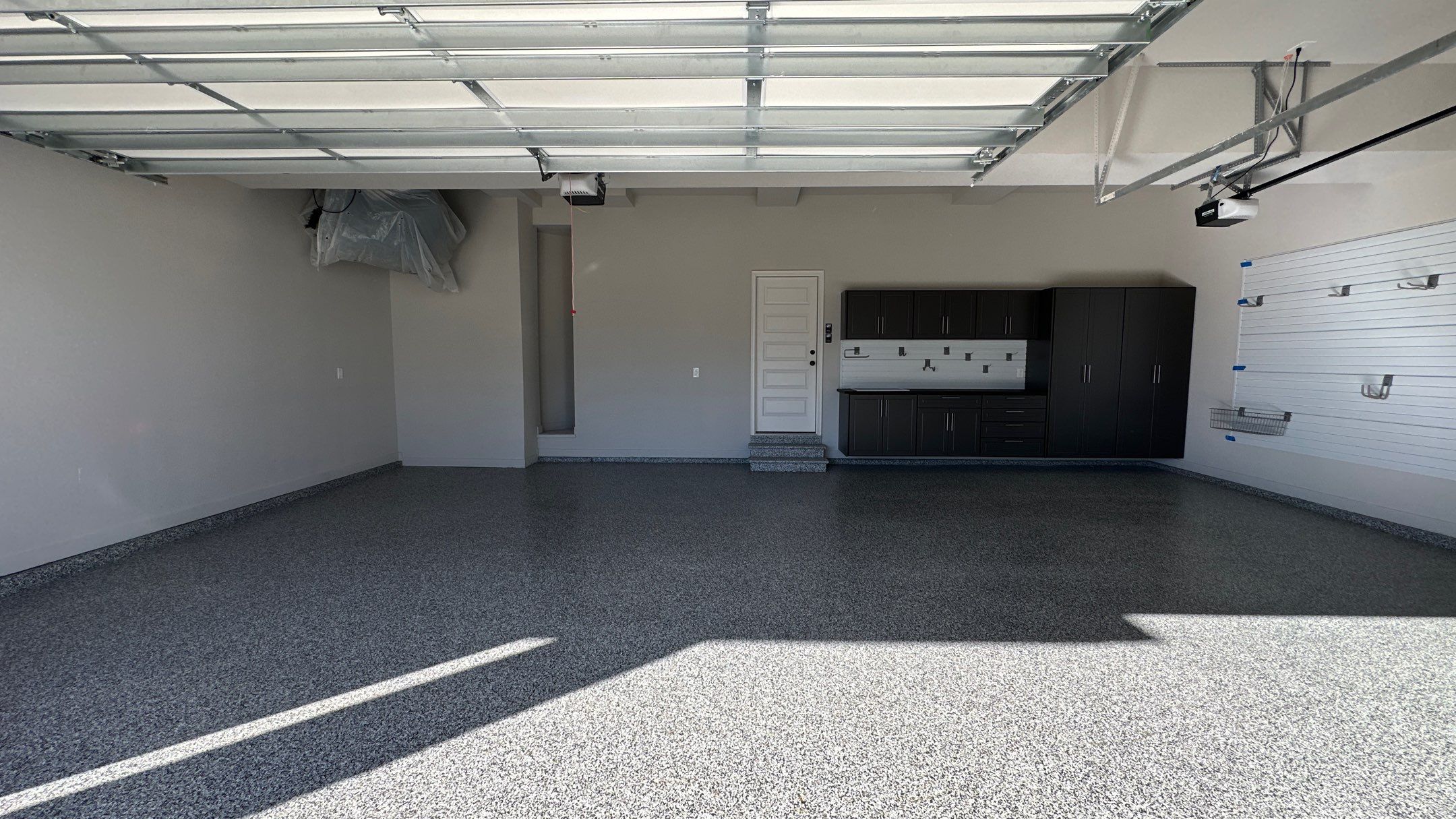 Banner Garage Floor, Redline GarageGear Cabinets, Heavy Duty Slotwall, RLGG Cabinets: "Pewter" Powder Coated, BG Floor: "Domino", SW HD Slatwall: "Brite White", Specialty "Black" HD Workbench/Countertop, RLGG Door/Drawer Style: Reverse Bead (Shaker), Specialty Cabinet: Sink, Garage Remodel, Garage Upgrade