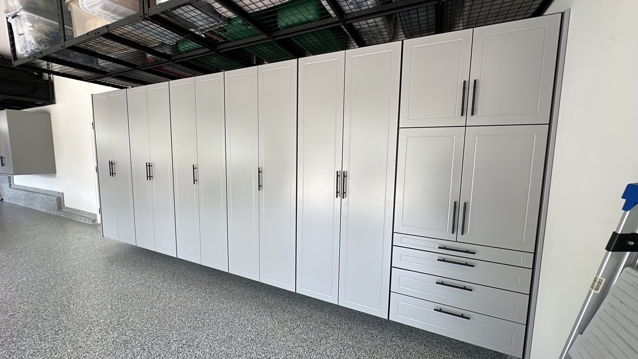 RLGG Cabinets: "Dove Grey" Powder Coated, Specialty Cabinet: 64"w "closet" tool cabinet, RLGG Door/Drawer Style: Reverse Bead (Shaker), Garage Remodel, Garage Upgrade, Redline GarageGear Cabinets, Heavy Duty Slotwall, SW HD Slatwall: "Weathered Grey"