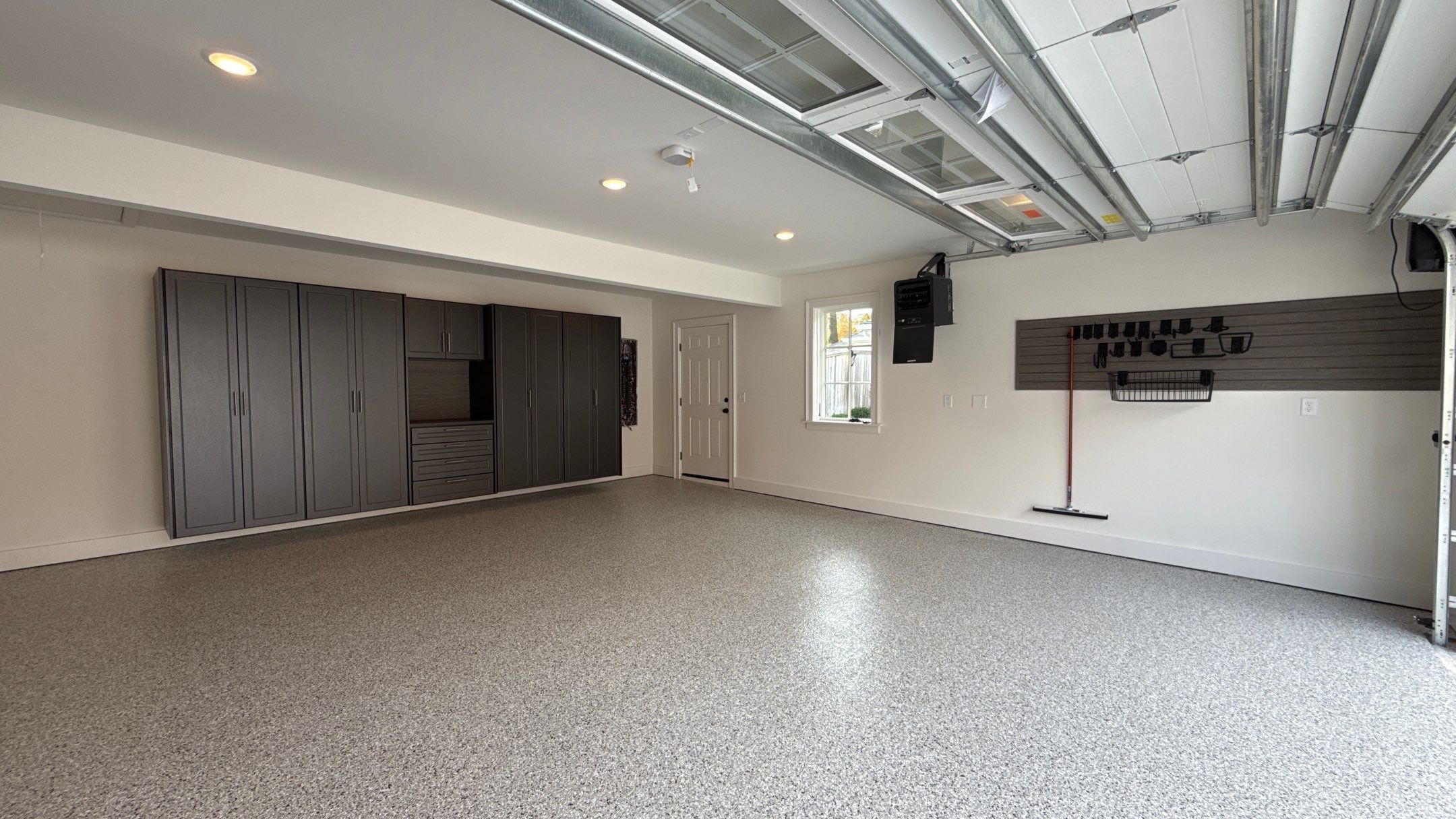 BG Floor: "Cabin Fever", Banner Garage Floor, MKE SW: Barnwood, MKE Slatwall, RLGG Cabinets: "Pewter" Powder Coated, RLGG Door/Drawer Style: Reverse Bead (Shaker), Specialty "Black" HD Workbench/Countertop, Redline GarageGear Cabinets, Garage Remodel, Garage Renovation, Garage Upgrade, Garage Wall Storage